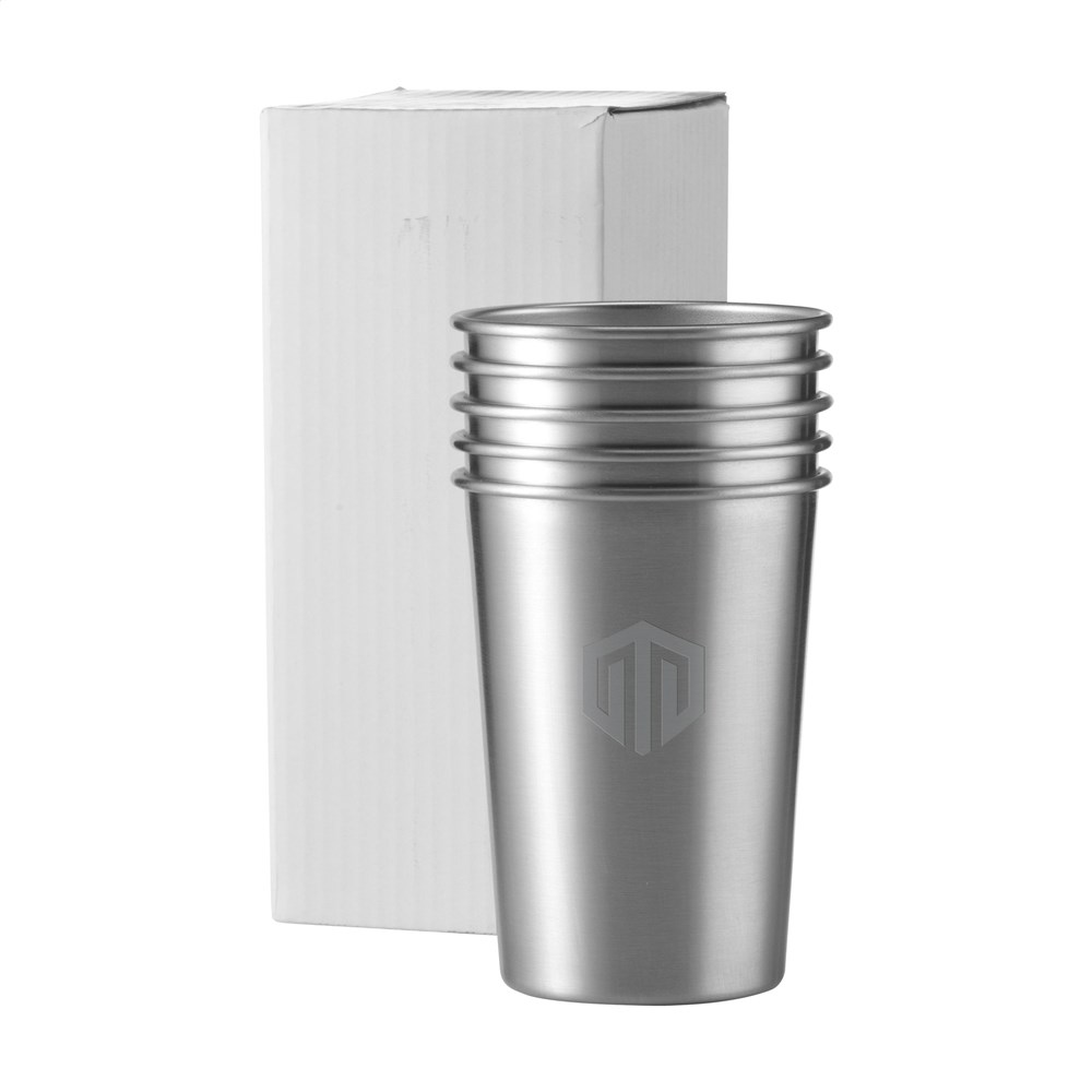 Onverwoestbare, herbruikbare RVS drinkbeker. Enkelwandig. Inhoud 350 ml. Verpakt per 5 stuks in een doosje.