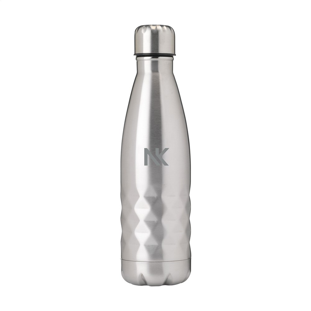 Dubbelwandige, lekvrije RVS waterfles/thermosfles met opvallend 3D-geometrisch diamantpatroon. Geschikt voor het op temperatuur houden van koude of warme dranken. Inhoud 500 ml. Per stuk in doos.