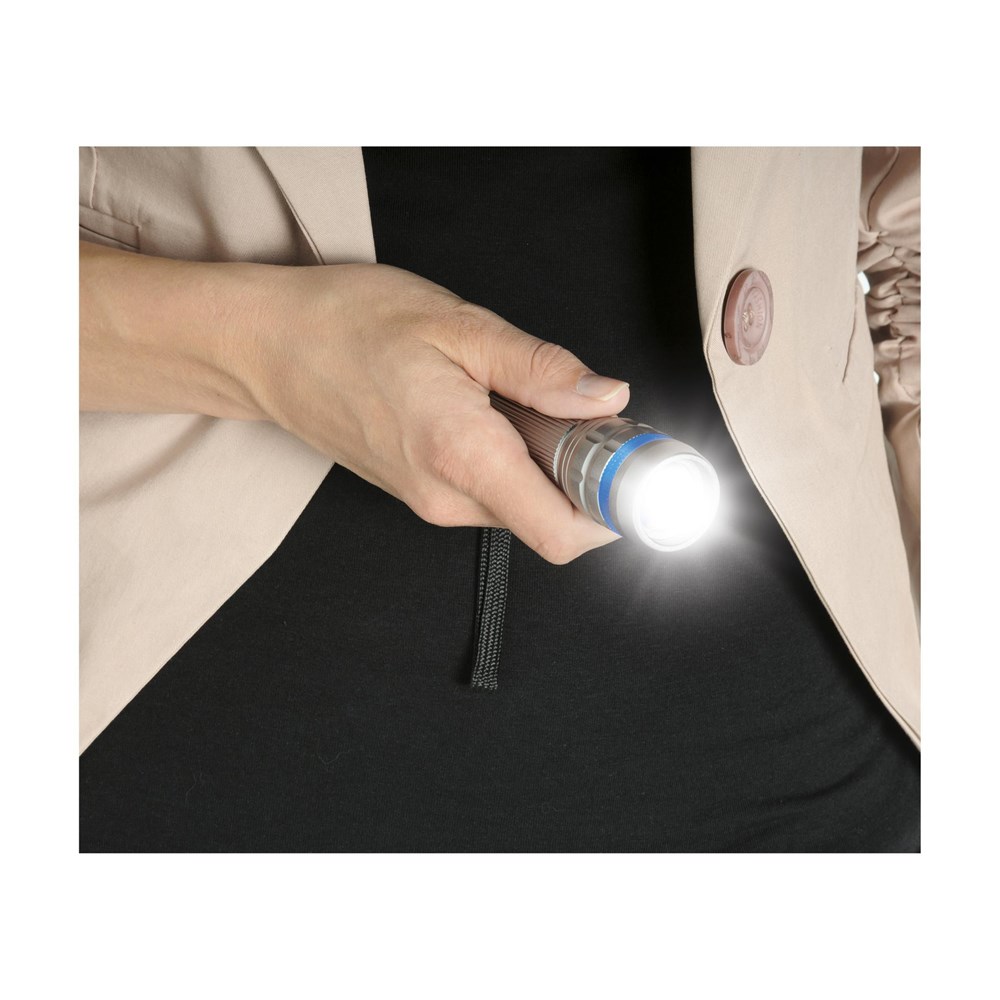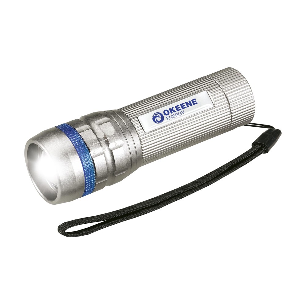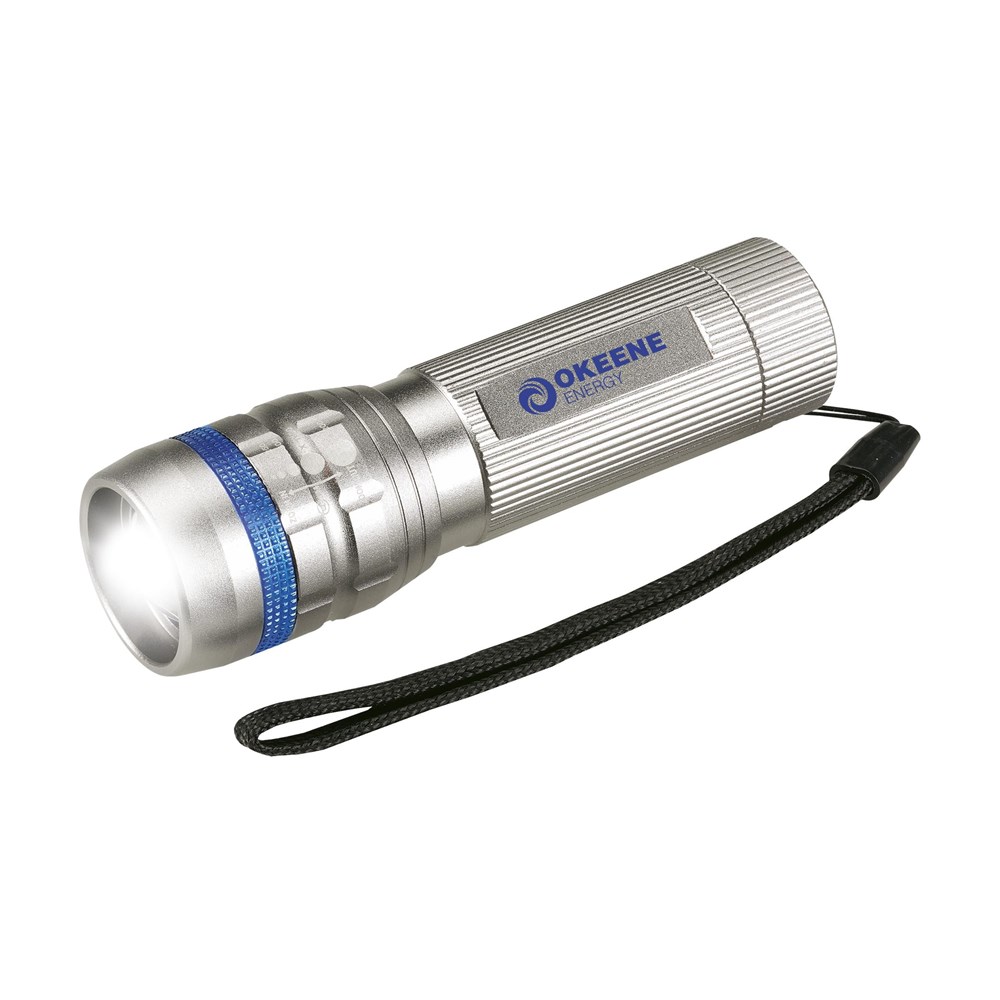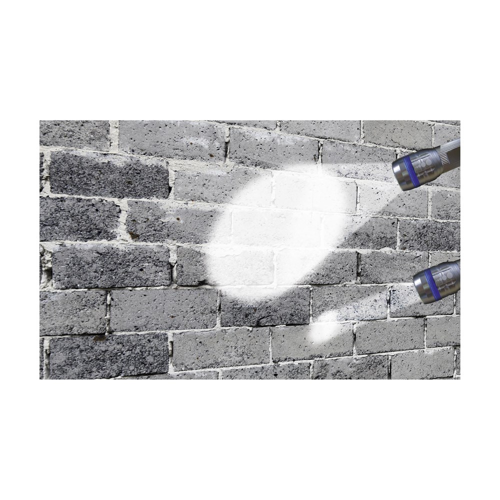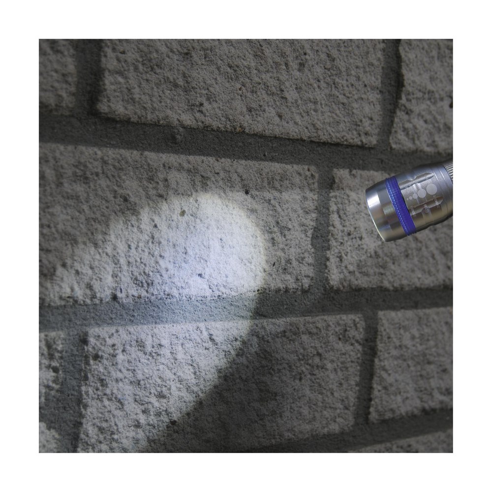 Solide, aluminium zaklamp met enorm felwitte lichtbundel dankzij de supersterke 3 Watt Cree LED-lamp. Meer licht, minder energieverbruik en een langere levensduur. De verstelbare lichtstraal bereikt een afstand tot 100 meter. In te stellen op zwak, sterk of knipperend licht. Afm. Ø 3,3 x 10 cm. Incl. batterijen en afneembare polslus. Per stuk in doos.