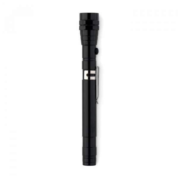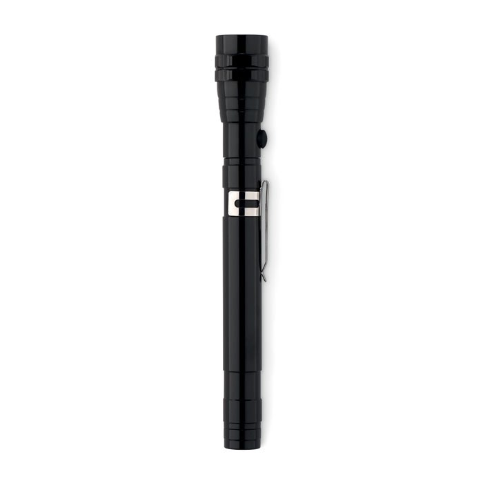 Uitschuifbare aluminium zaklamp met 3 LED lampjes, magneet en clip. Inclusief 4 LR44 batterijen. Maximum lengte 57 cm.