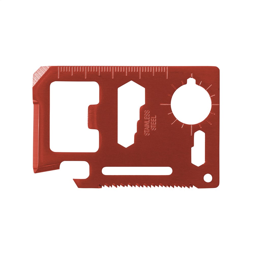 RVS multitool in creditcardformaat met 11 functies: blikopener, mes, schroevendraaier, liniaal, flesopener, moersleutel, vleugelmoersleutel , zaag, koersgraad aanwijzer, 2-positie sleutel en sleutelringgat. In imitatieleren etui. Inclusief gebruiksaanwijzing.