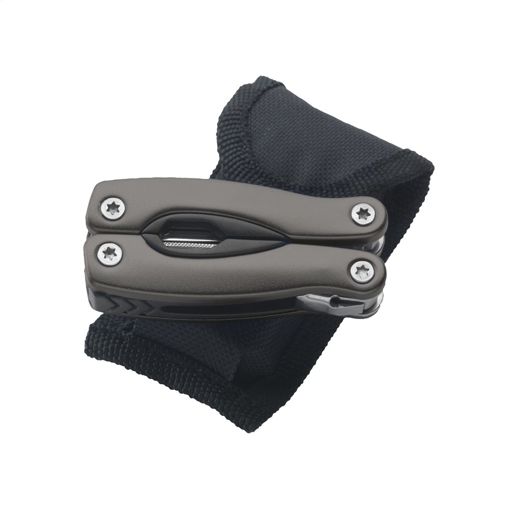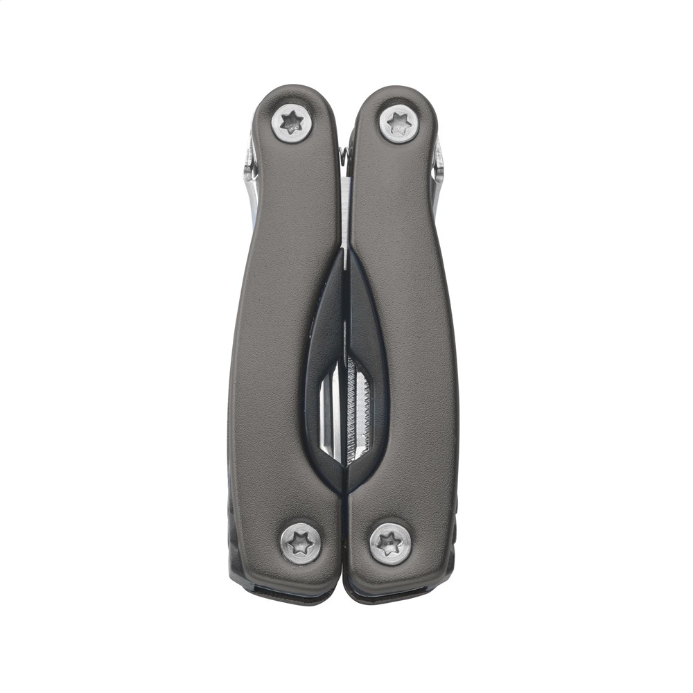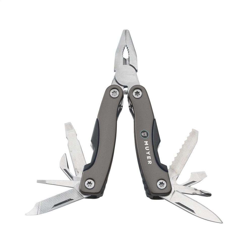 Compacte RVS multitang met aluminium handgreep in metallic look. 9-delig met 13 functies: tang, draadknipper, 3 schroevendraaiers, priem, vijl, blikopener, flesopener, visschraper, visonthaker, mes, philips kruiskopschroevendraaier. Met vergrendeling. In nylon etui. Op het bezit en/of dragen van messen of multitools in het openbaar kunnen lokale regels van toepassing zijn. Per stuk in doosje.
