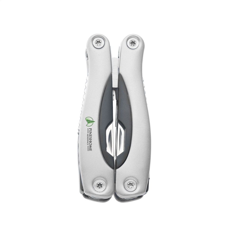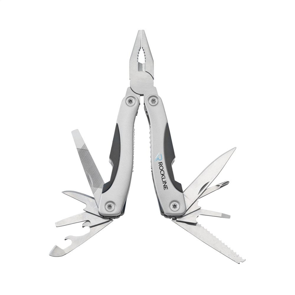 Compacte RVS multitang met aluminium handgreep in metallic look. 9-delig met 13 functies: tang, draadknipper, 3 schroevendraaiers, philips kruiskopschroevendraaier, vijl, zaag/visschraper, mes, priem, blikopener, flesopener. In 600D nylon etui. Op het bezit en/of dragen van messen of multitools in het openbaar kunnen lokale regels van toepassing zijn. Per stuk in doosje.