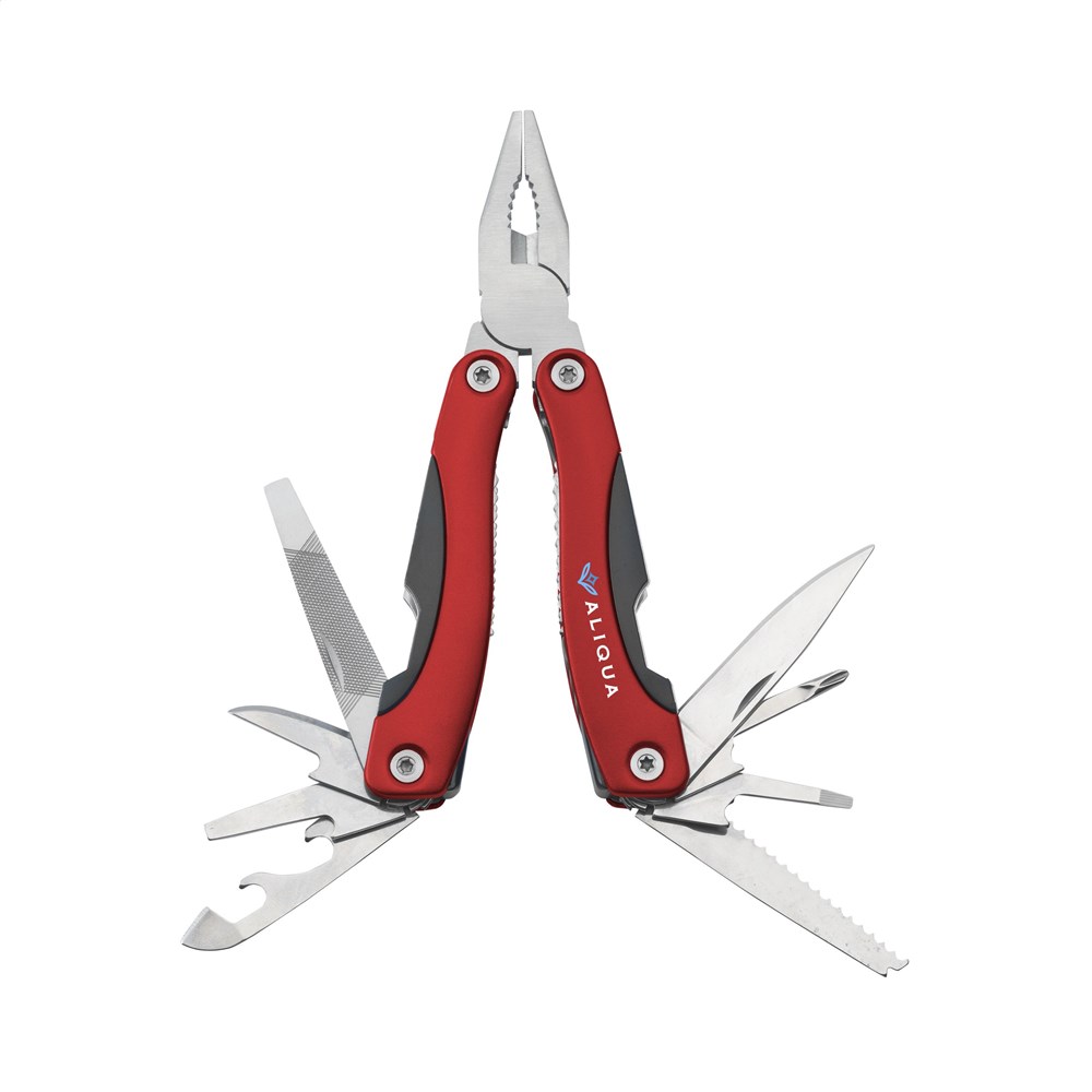 Compacte RVS multitang met aluminium handgreep in metallic look. 9-delig met 13 functies: tang, draadknipper, 3 schroevendraaiers, philips kruiskopschroevendraaier, vijl, zaag/visschraper, mes, priem, blikopener, flesopener. In 600D nylon etui. Op het bezit en/of dragen van messen of multitools in het openbaar kunnen lokale regels van toepassing zijn. Per stuk in doosje.