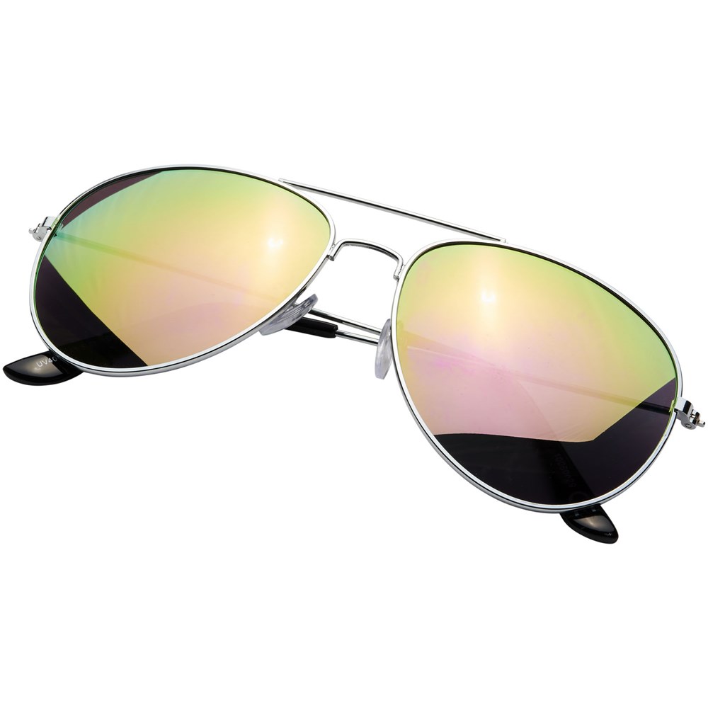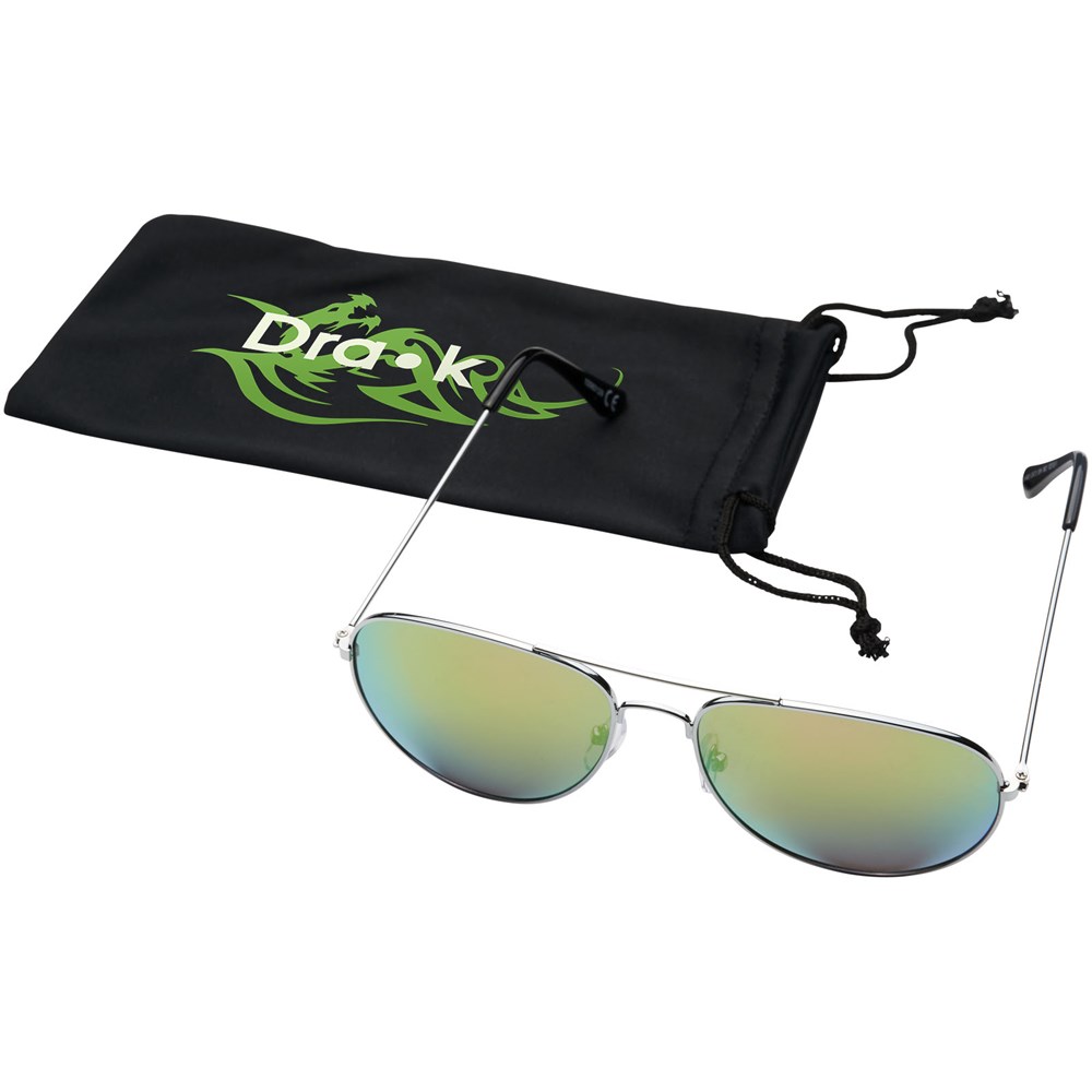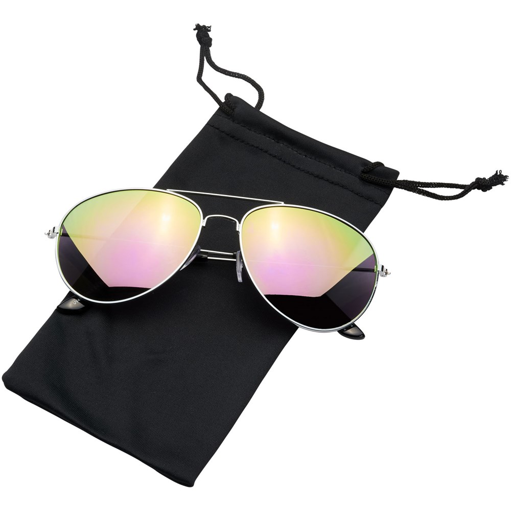Klassiek vormgegeven zonnebril met trendy gekleurde spiegelglazen. Wordt geleverd met zakje van microvezel dat gebruikt kan worden als reinigingsdoekje. Voldoet aan EN ISO 12312-1 en UV-400, glazen zijn van klasse 3.