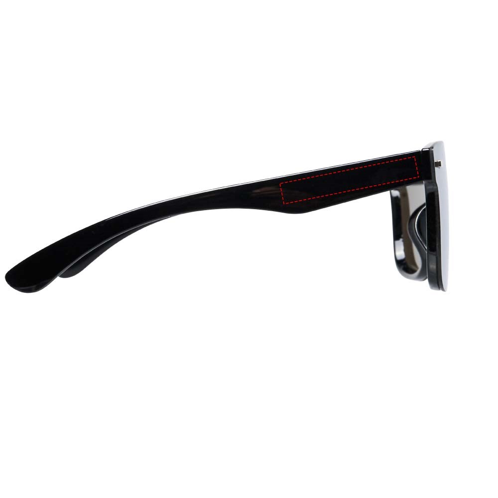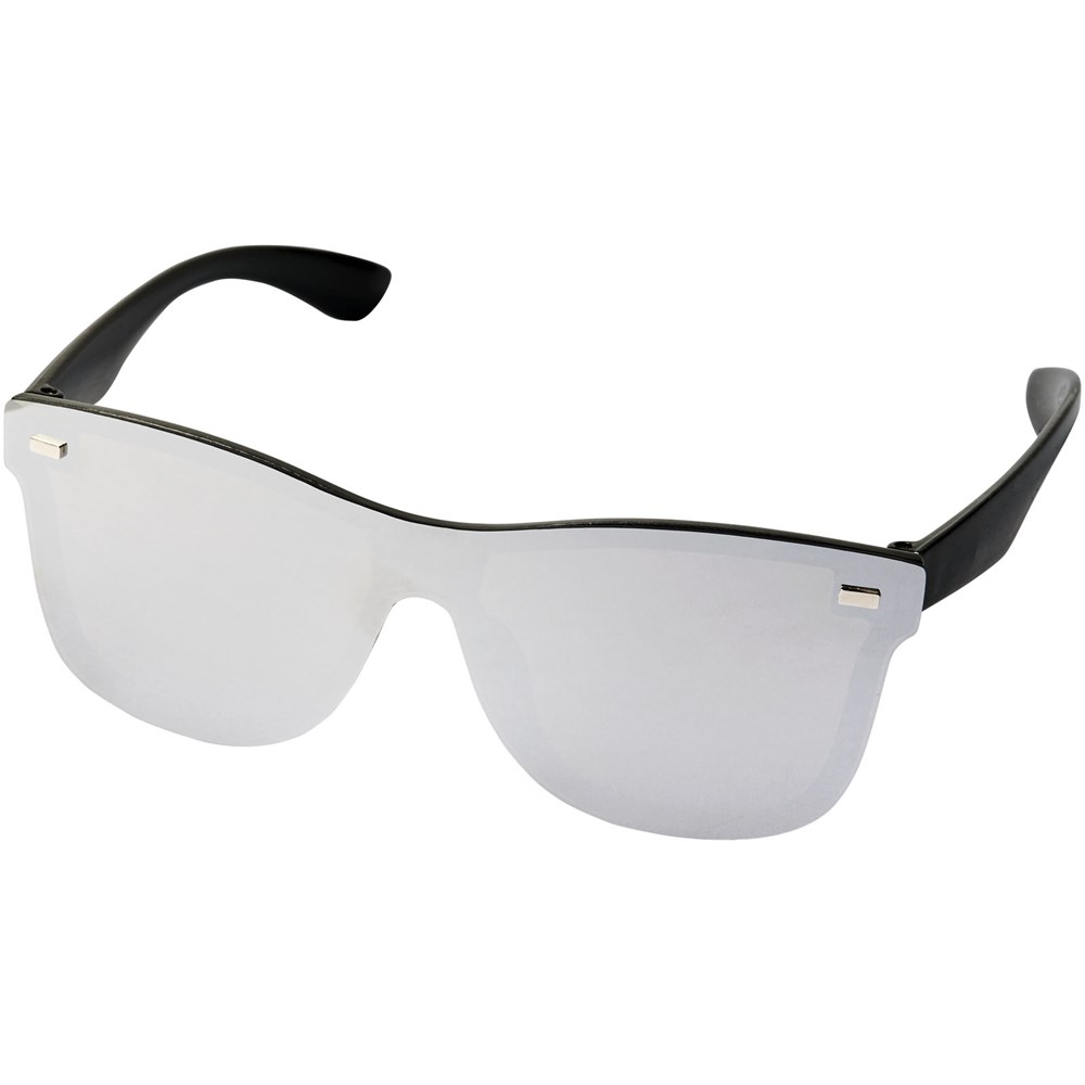 Shield zonnebril met trendy design en spiegelglazen. Voldoet aan EN ISO 12312-1 en UV-400, glazen zijn van klasse 3.