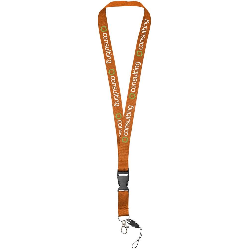 Deze multifunctionele lanyard is voorzien van een afneembare gesp, ovalen haak met musketonsluiting en telefoonhouder. Ideaal voor badge, ID-kaart of sleutels. Verkrijgbaar in een groot aantal kleuren en altijd indrukwekkend veel ruimte voor uw logo. Een compleet assortiment voor alle toepassingen. Geen instelkosten voor tweede locatie bij identiek bedrukkingspatroon aan beide zijden.