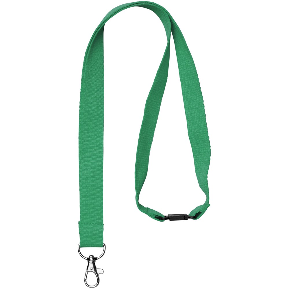 100% katoenen lanyard met veiligheidssluiting. Geweldige prijs/kwaliteitverhouding en indrukwekkende logoformaten bij het zoeken naar een groene keuze. Hoogwaardige ovalen haak met karabijnsluiting die ideaal is voor het vastmaken van een naambadge, ID-kaart of sleutels.