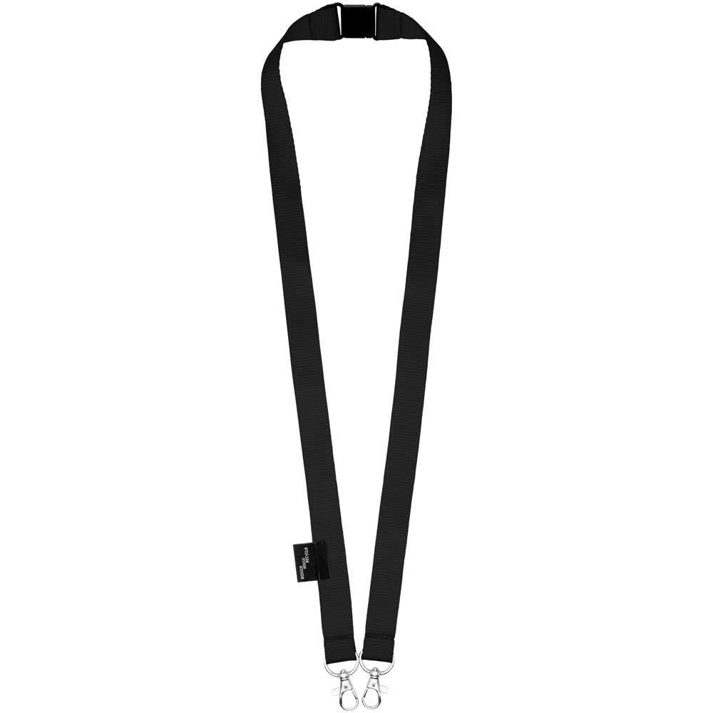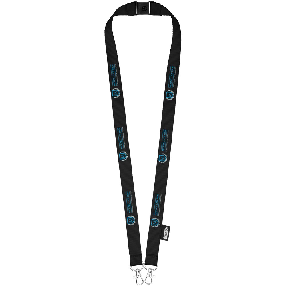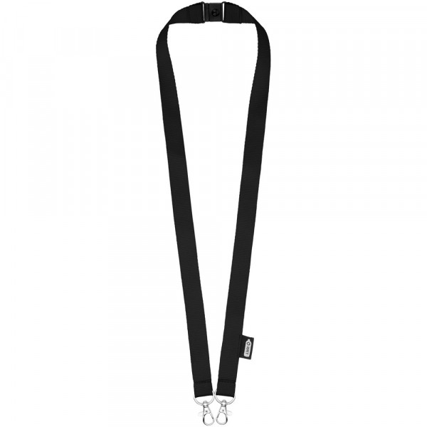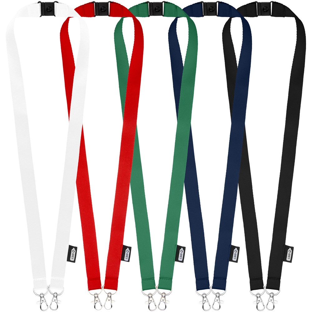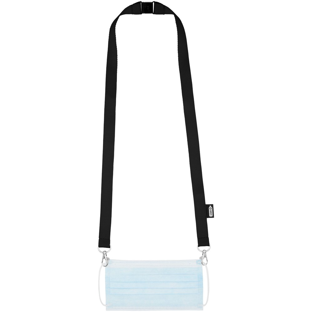 Gerecycled PET lanyard met veiligheidssluiting voor een mondmasker en badgehouder. Wordt geleverd met twee hoogwaardige ovale haken met kreeftsluitingen. Bijzonder geschikt voor brede kaarthouders. Geweldige prijs/kwaliteitverhouding en indrukwekkende logoformaten bij het zoeken naar een groene keuze.