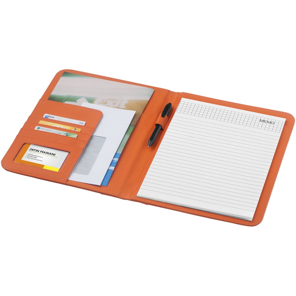 Portfolio A4 formaat met pennenlus, documentvakken en notitieblok met 20 pagina's gelinieerd papier. Pen en accessoires niet inbegrepen.