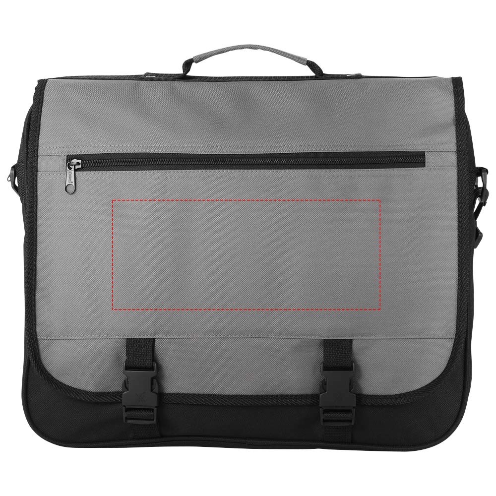 Conferentietas met verstelbare schouderband, gespsluiting, ritsvak in de flap, hoofdvak met ritssluiting en diverse open vakjes onder de flap.