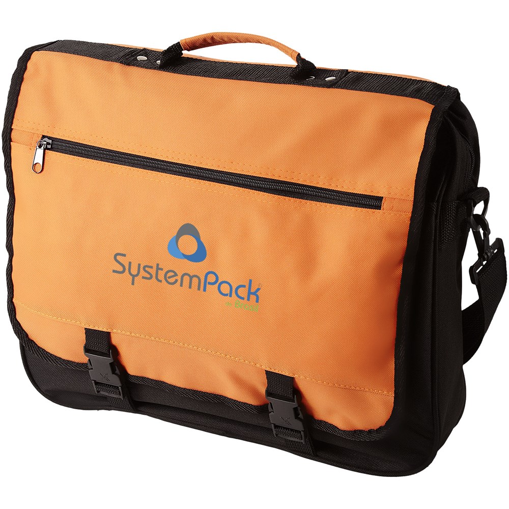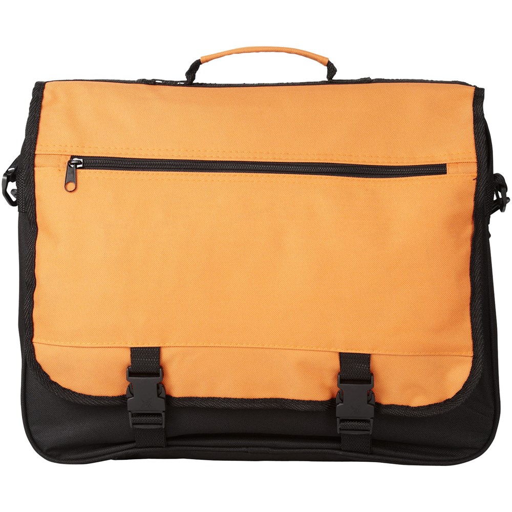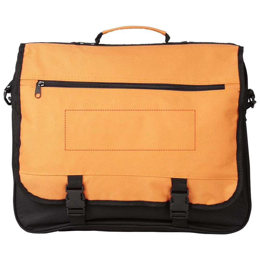Conferentietas met verstelbare schouderband, gespsluiting, ritsvak in de flap, hoofdvak met ritssluiting en diverse open vakjes onder de flap.