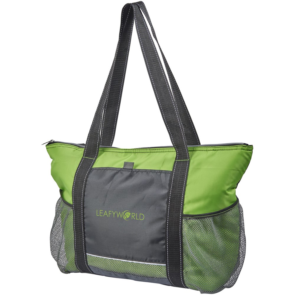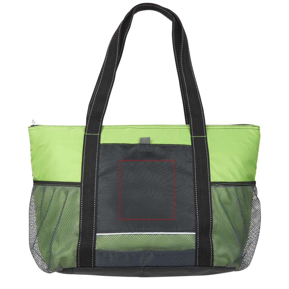Hoofdvak met ritssluiting. Voorvak en twee zijvakken. Draaghoogte 30 cm. Geschikt voor 30 blikjes inclusief sleutellus aan de voorkant van de tas.