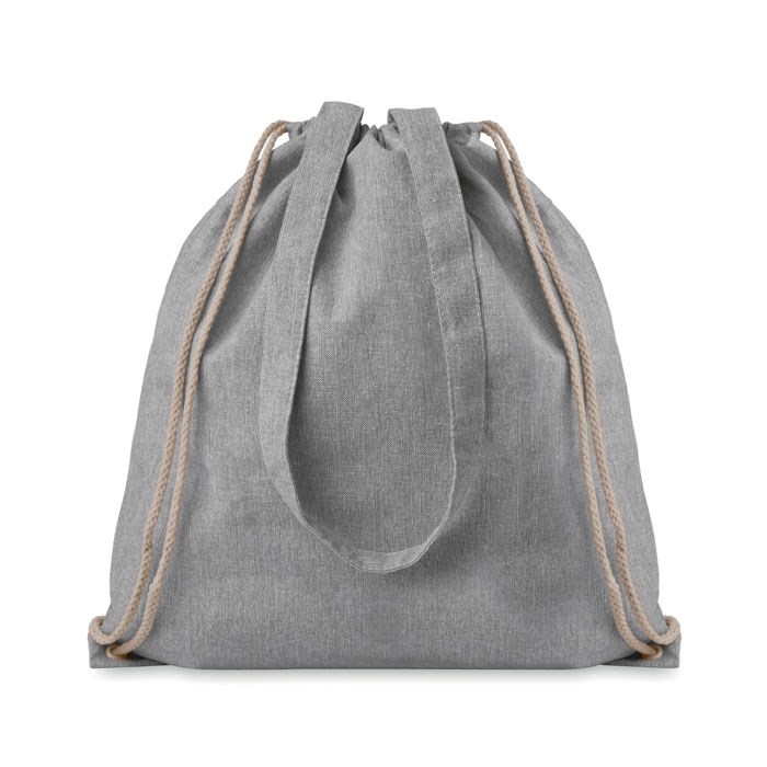 Draagtas van gerecycled katoen en gerecycled polyester met trekkoorden en lange draaghengsels. Gewicht ca. 140 gr/m². Dit artikel kan krimpen na het afdrukken.