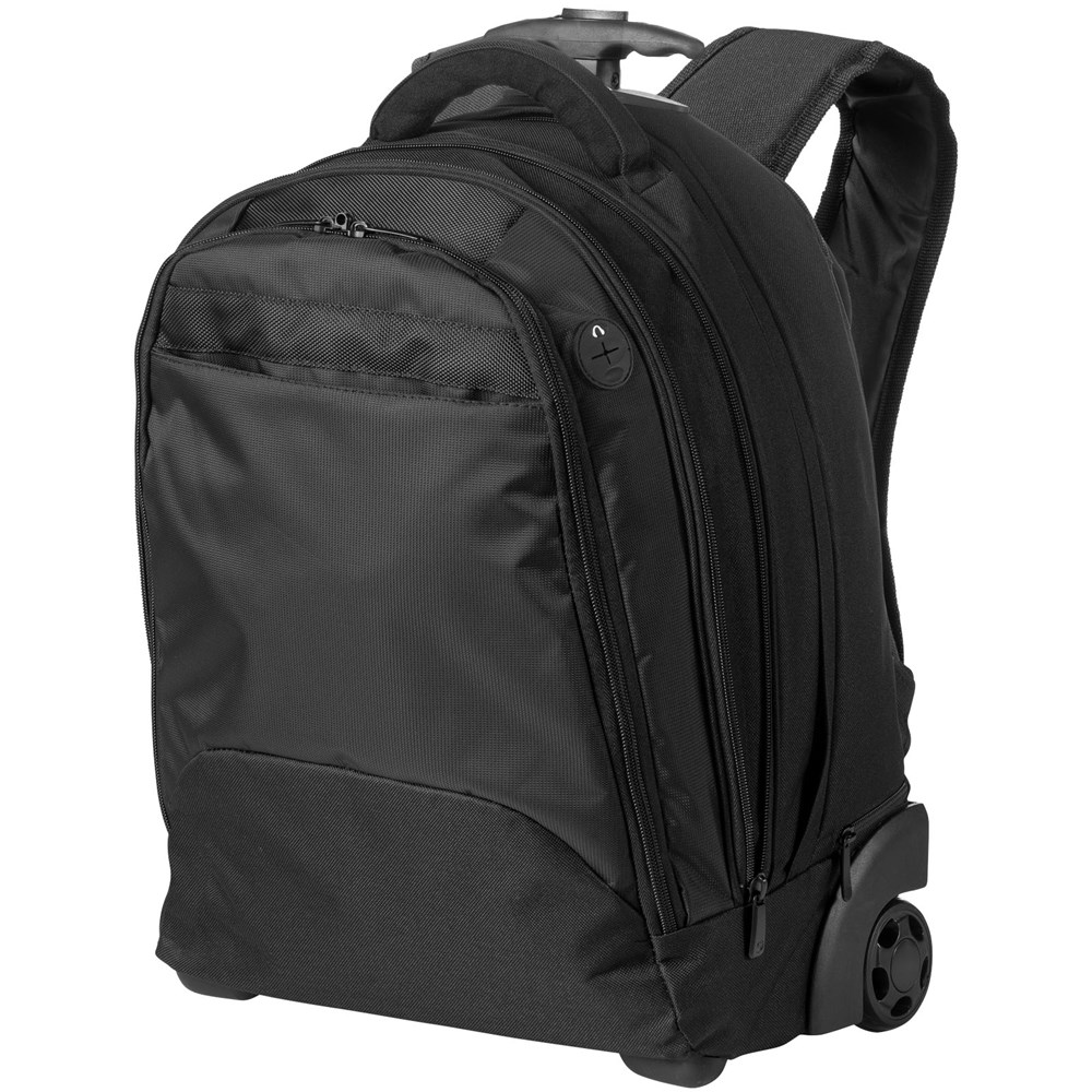 Rugzak met hoofdvak met tabbladen en laptopvak. Geschikt voor de meeste 17" laptops. Voorvak met organizer en mediavak met oortelefoondoorgang. Telescoopgreep en soepel lopende wieltjes met afneembare cover. Verborgen schouderbanden en comfortabele draaggreep.