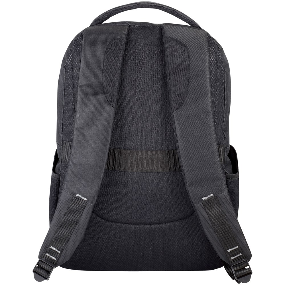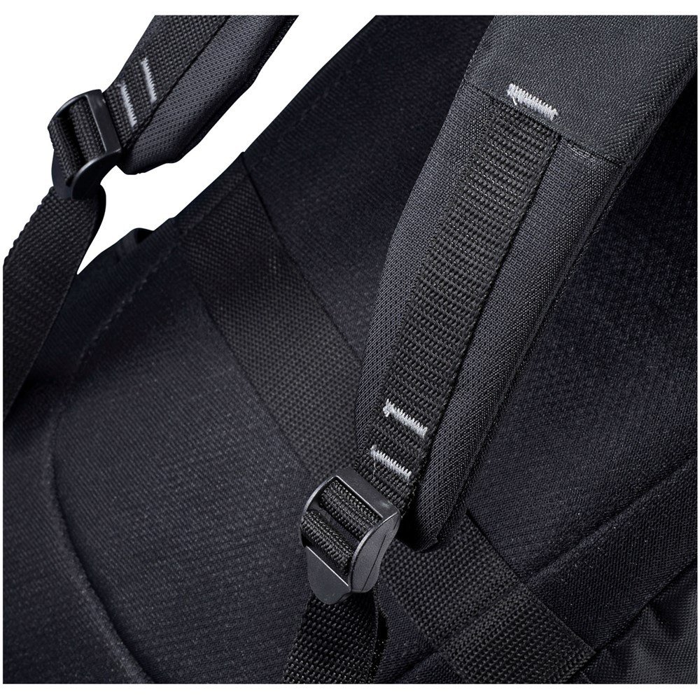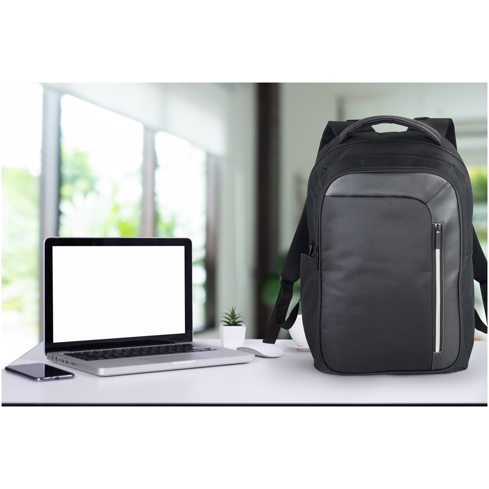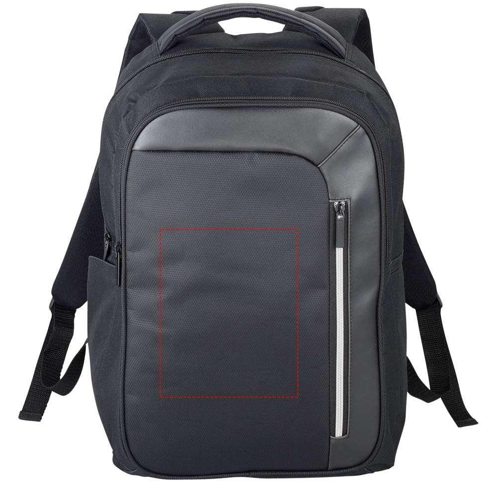 Strakke, moderne 15 "laptop rugzak met een grote voorzijde rits met sleutelhangerhouder. Een verborgen RFID-technologie beschermt je bankpassen en paspoort tegen identiteitsfraude. Het grote gevoerde hoofdvak biedt plaats voor een 15" laptop en een apart gevoerd vak voor iPad of tablet. De voorste verticale rits is ontworpen om snel toegang tot het voorvak tegeven. 2 extra zijvakken voor extra opslagruimte en de verstelbare gevoerde schouderbanden met singels details zijn comfortabel. Het handvat en een trolleyband maakt het reizen makkelijk. Er kunnen kleine variaties voorkomen in de kleur van het eigenlijke product, vanwege de aard van de kleurstoffen, de weefsels en de bedrukking.