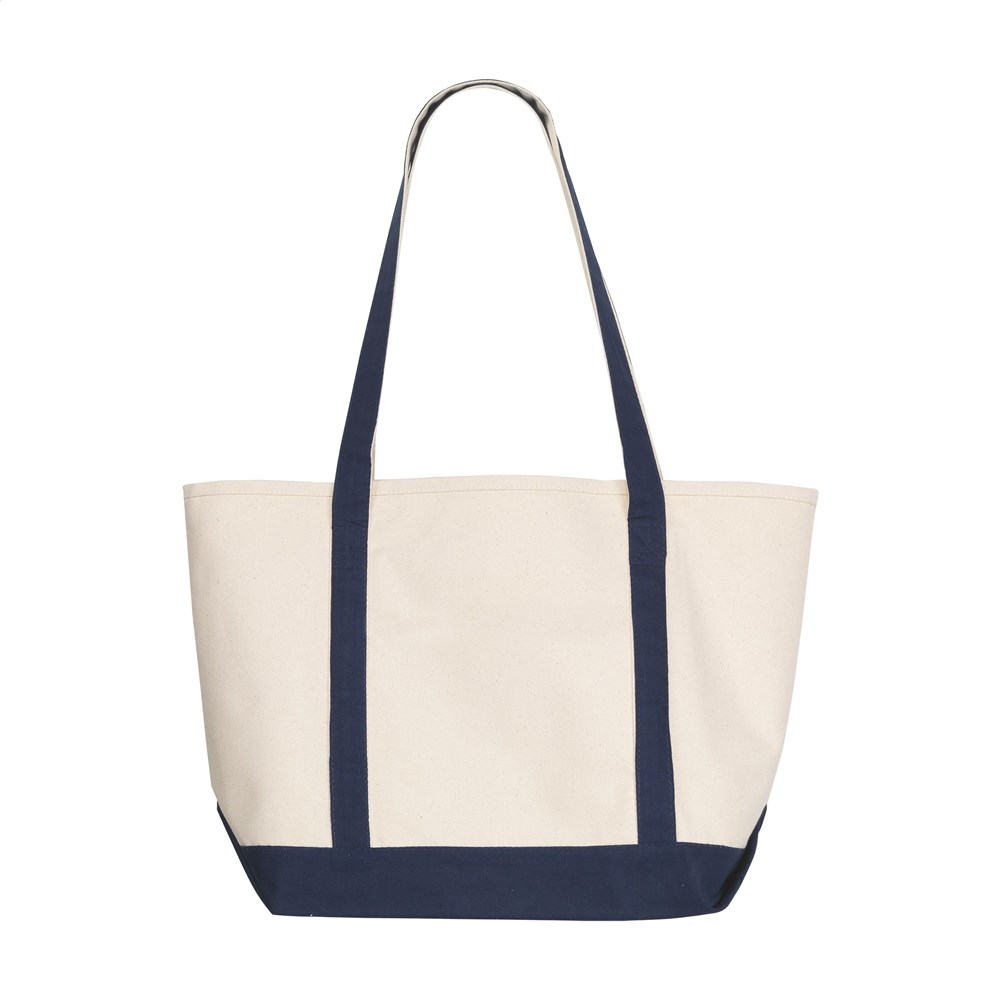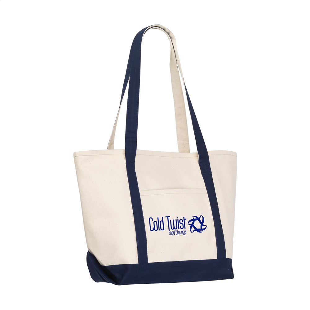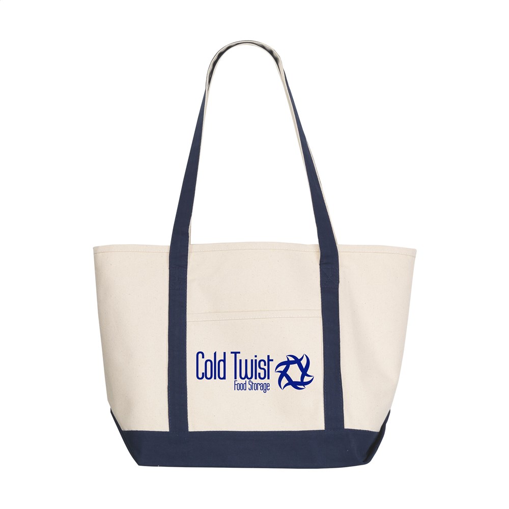 Mooie winkel- en strandtas van stevig canvas (390 g/m²). Breed en tijdloos model met lange hengsels en insteekvak aan de voorzijde. In naturel met opvallende kleuraccenten.