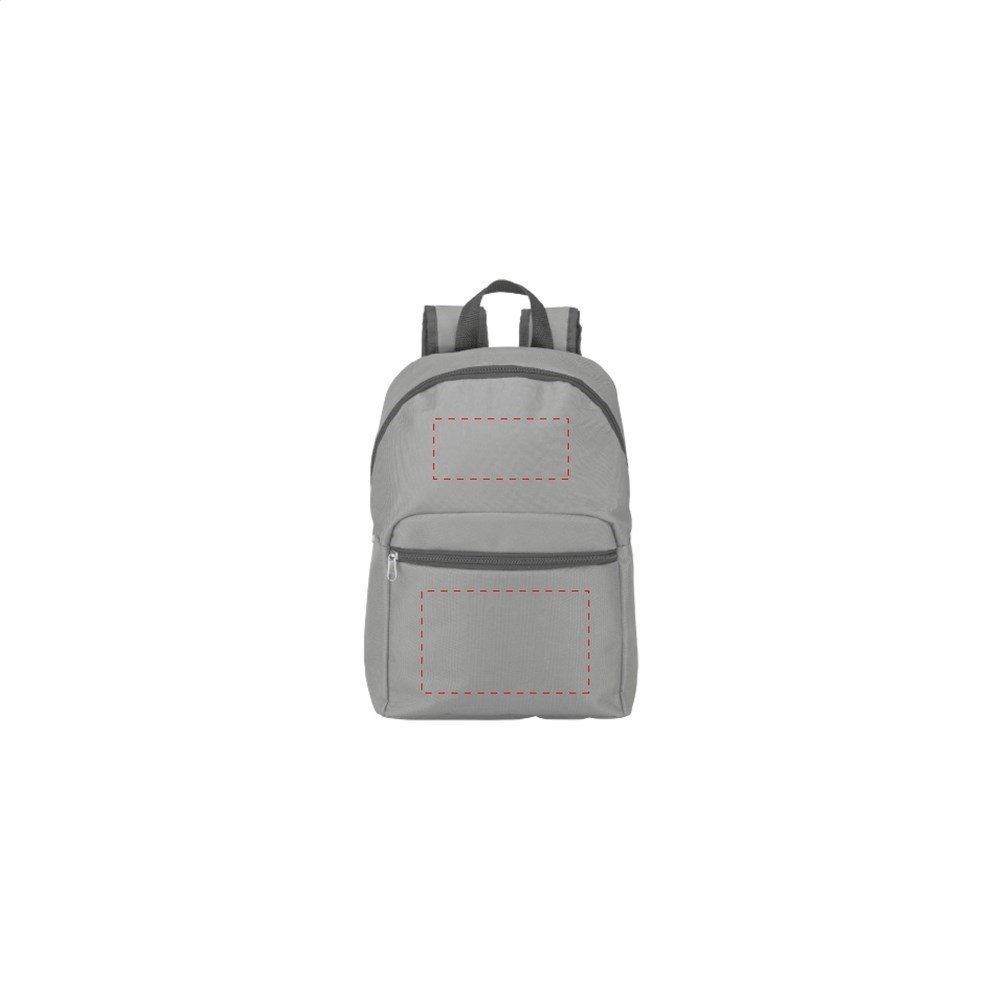 Rugzak van 600D polyester met royaal hoofdvak, voorvak met rits, verstelbare, gewatteerde schouderriemen, ophanglus en waterafstotende binnenzijde.