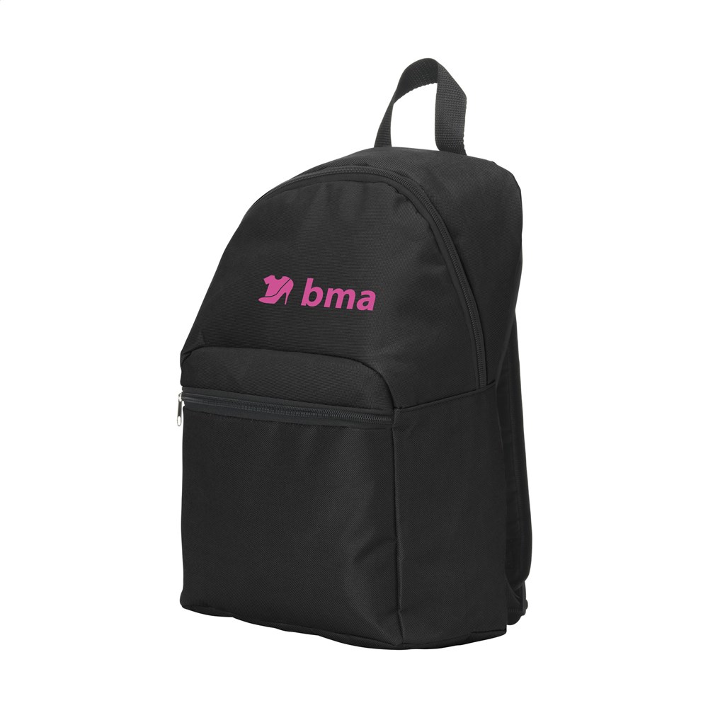 Rugzak van 600D polyester met royaal hoofdvak, voorvak met rits, verstelbare, gewatteerde schouderriemen, ophanglus en waterafstotende binnenzijde.