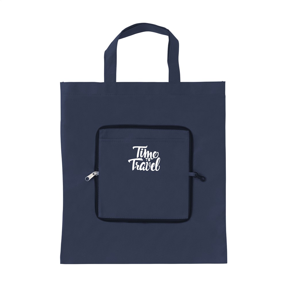 Opvouwbare, nonwoven (80g/m²) winkeltas met insteekvak. In compact etui met ritssluiting en karabijnhaak. Afm. uitgevouwen 37 x 40 cm.