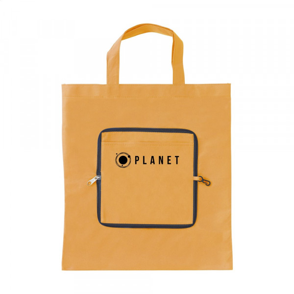 Opvouwbare, nonwoven (80g/m²) winkeltas met insteekvak. In compact etui met ritssluiting en karabijnhaak. Afm. uitgevouwen 37 x 40 cm.