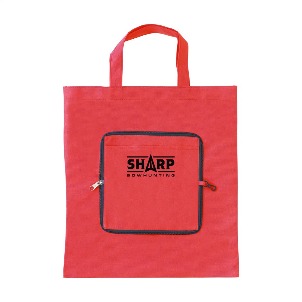 Opvouwbare, nonwoven (80g/m²) winkeltas met insteekvak. In compact etui met ritssluiting en karabijnhaak. Afm. uitgevouwen 37 x 40 cm.