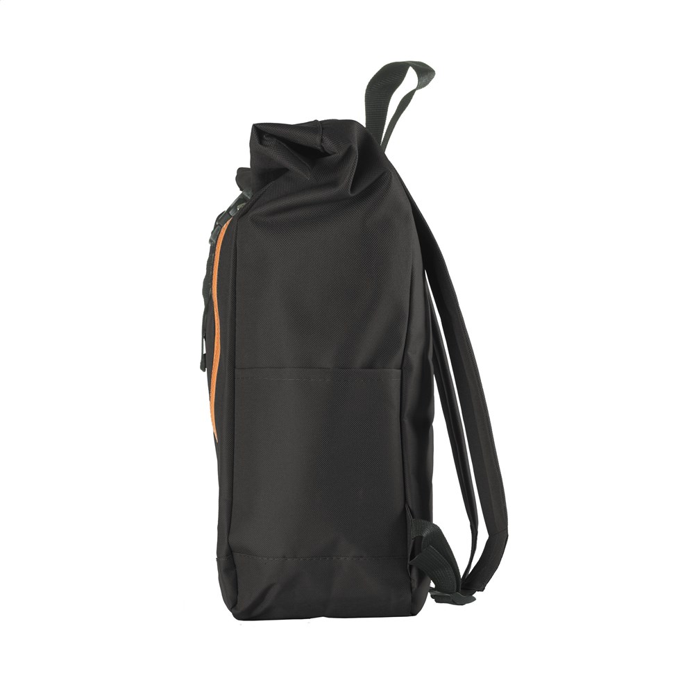 Stoere, praktische urban rugzak van sterk 600D polyester met waterbestendige PVC binnenzijde, gedeeltelijk nylon gevoerd. De rugzak heeft één groot binnenvak, een insteekvak aan beide zijdes en een groot ritsvak aan de voorzijde. Met foam rugzijde voor meer draagcomfort, gewatteerde, verstelbare schouderriemen en draaglus. Met oprolbare sluiting en handig kliksysteem. De perfecte tas voor dagelijks gebruik. Inhoud ca. 18 liter.