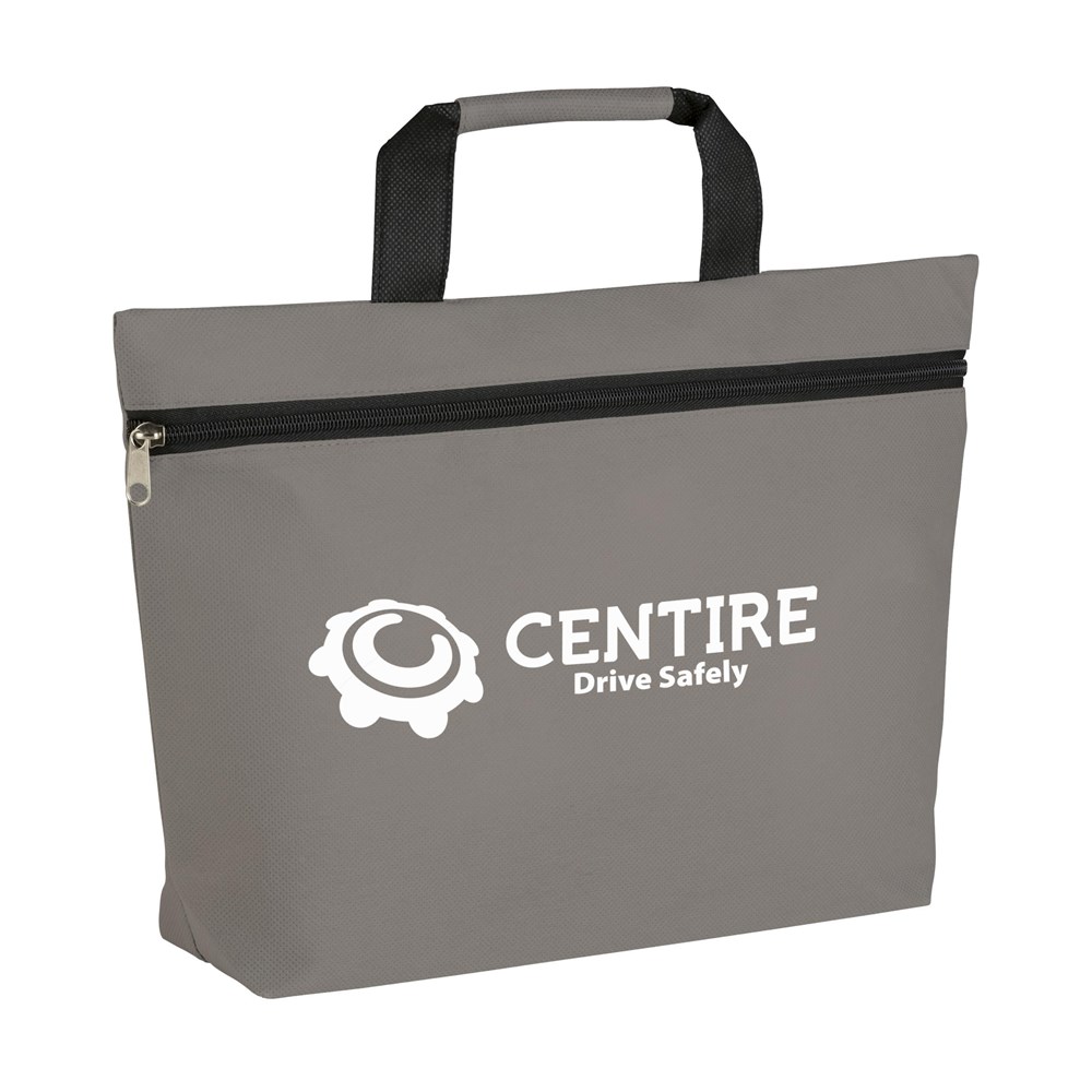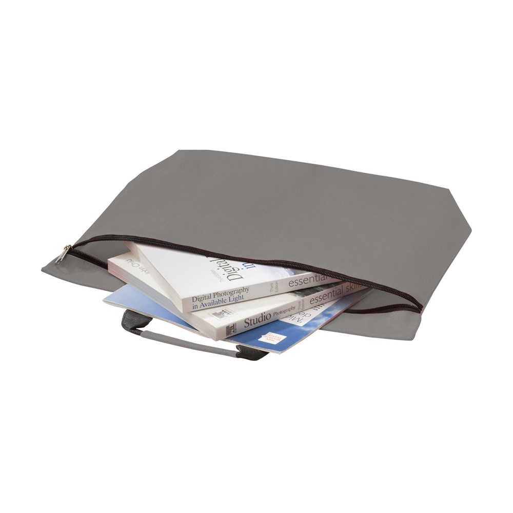 Praktische nonwoven (80 g/m²) documententas. Met rits, verstevigde handgreep met kleuraccent en breed uitlopende onderzijde. Superlicht en sterk.