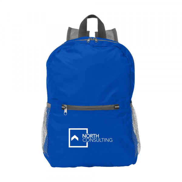 Complete, opvouwbare, lichtgewicht rugzak van sterk, slijtvast 190T jaquard polyester. Met veel opbergruimte, een ritsvak aan de voorzijde, 2 gaasvakken, verstelbare, mesh schouderriemen en een draaglus. Van rugzak naar pouch: vouw de rugtas in het extra opbergvakje aan de achterzijde en sluit de rits. Afm. opgevouwen 21 x 17 x 3 cm.