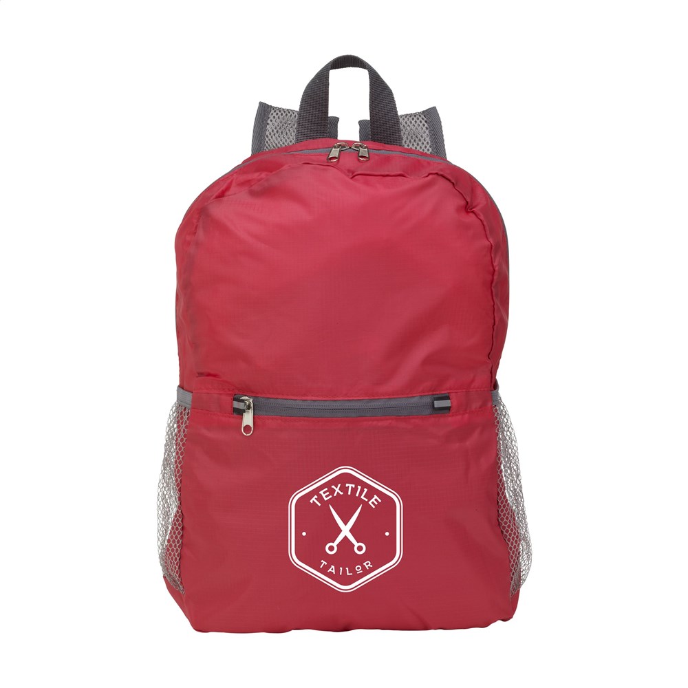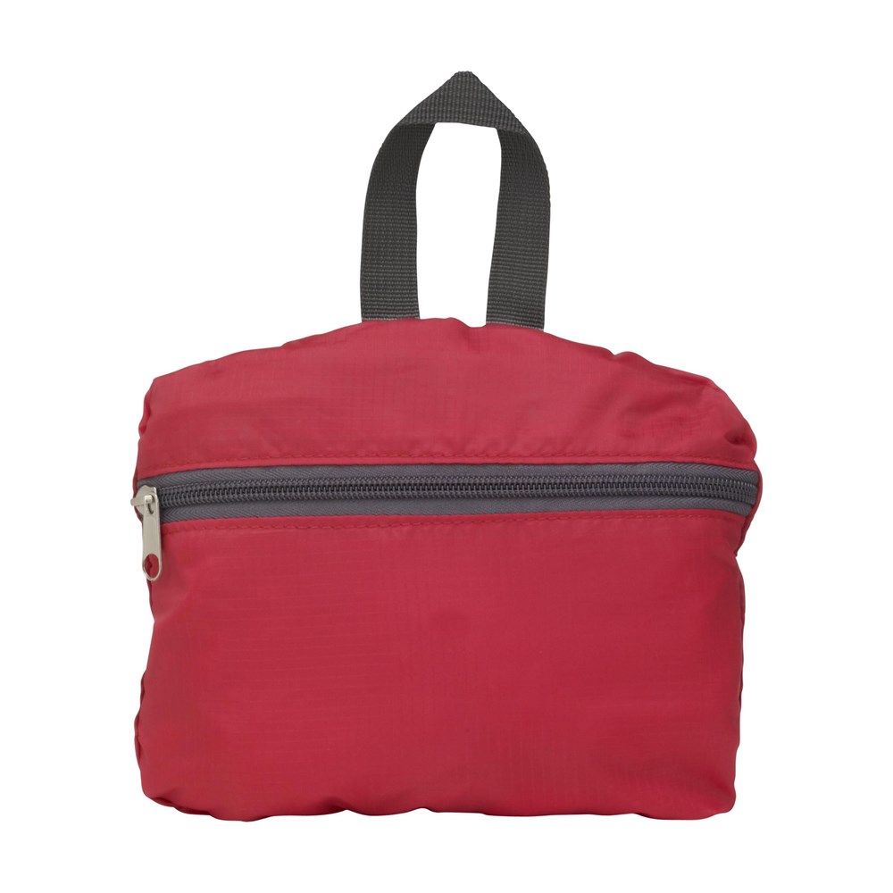 Complete, opvouwbare, lichtgewicht rugzak van sterk, slijtvast 190T jaquard polyester. Met veel opbergruimte, een ritsvak aan de voorzijde, 2 gaasvakken, verstelbare, mesh schouderriemen en een draaglus. Van rugzak naar pouch: vouw de rugtas in het extra opbergvakje aan de achterzijde en sluit de rits. Afm. opgevouwen 21 x 17 x 3 cm.