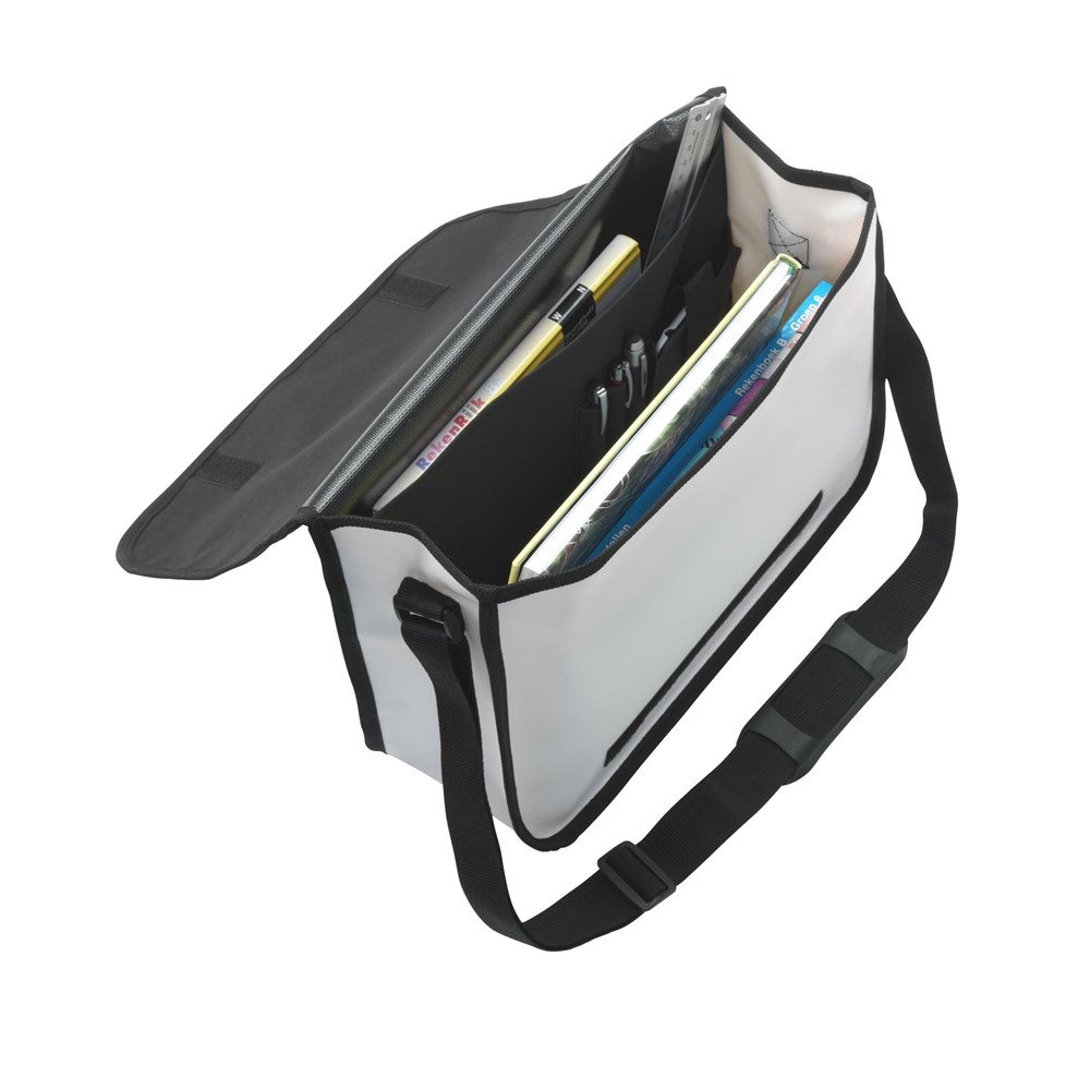 Trendy Tarpaulin schouder-/documententas. Vervaardigd van oersterk, waterbestendig en vuilafstotend (vrachtwagen)zeil. Opvallend door de fraaie matt finish. Met hoofdvak, ruim insteekvak, diverse insteekvakjes, verstelbare schouderriem met gripvast schouderstuk en klittenbandsluiting.
