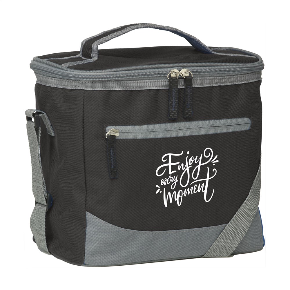 Handig formaat koeltas van geweven 600D polyester. Met ruim koelvak, ritsvak aan de voorzijde, handgreep en verstelbare schouderriem. Geschikt voor 12 blikjes drank.