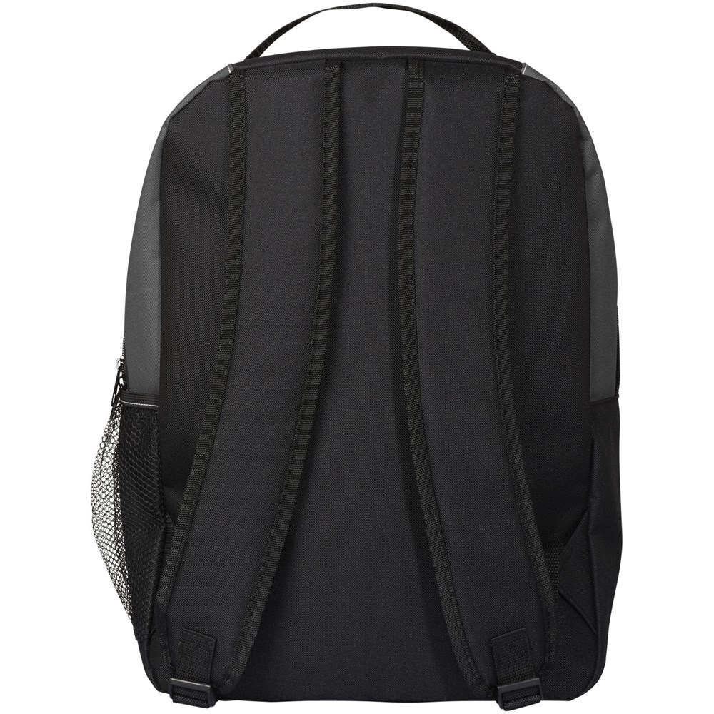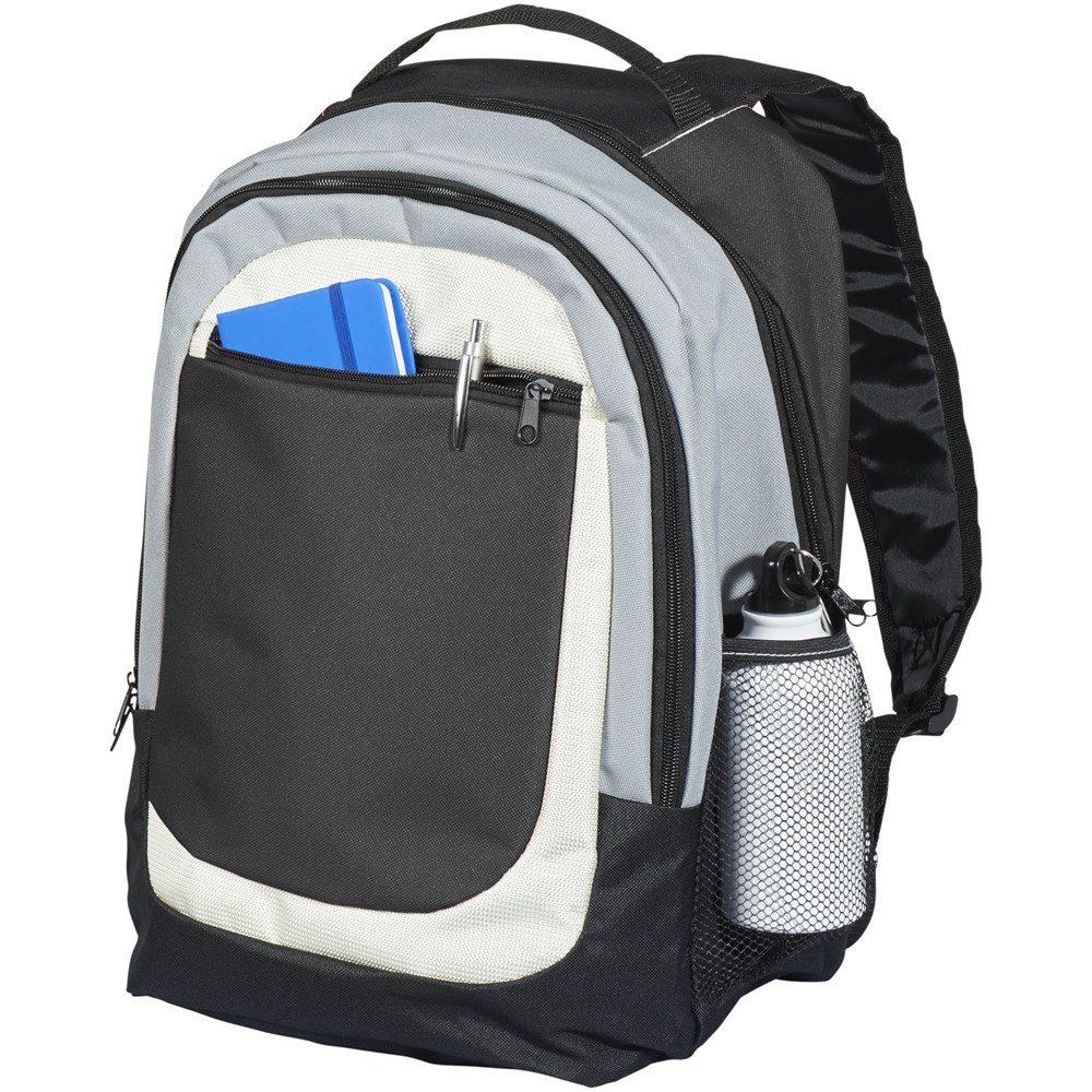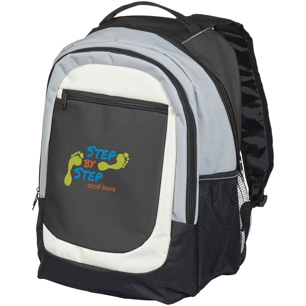 Rugzak met twee hoofd compartimenten. Voorvak met ritssluiting. De gevoerde schouderriem en rug zorgen voor comfort.