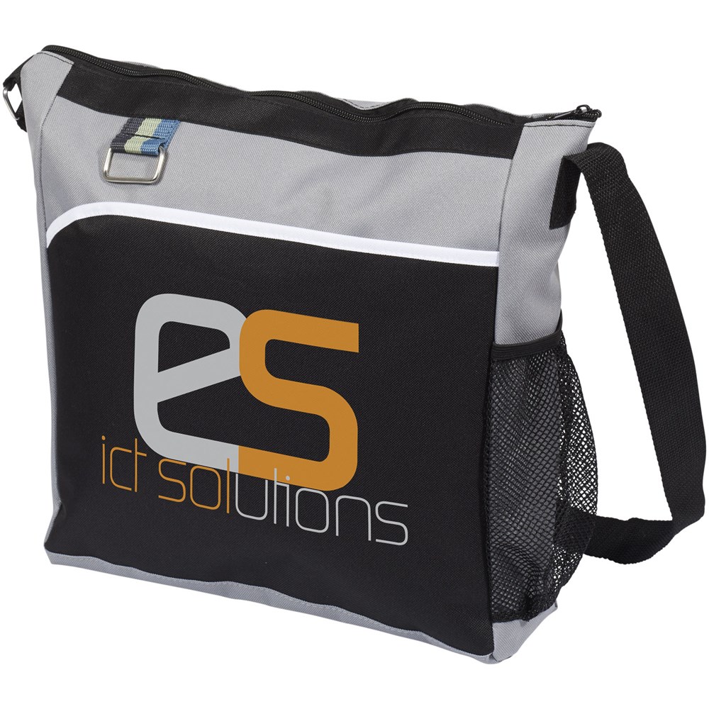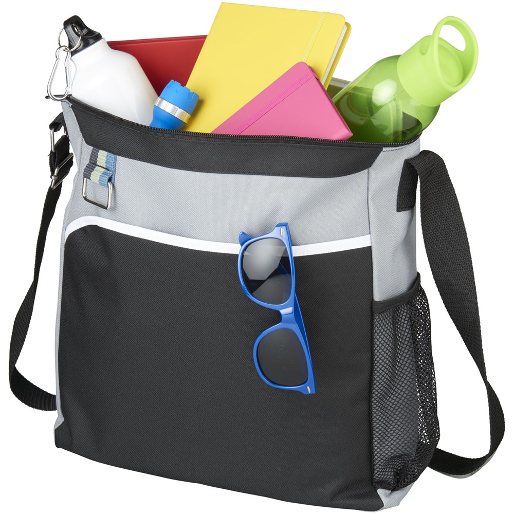 Hoofdvak met ritssluiting en voorvak. Waterfles zak met metalen sleutelhanger. Verstelbare schouderband.