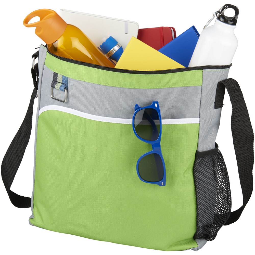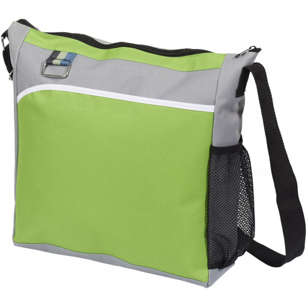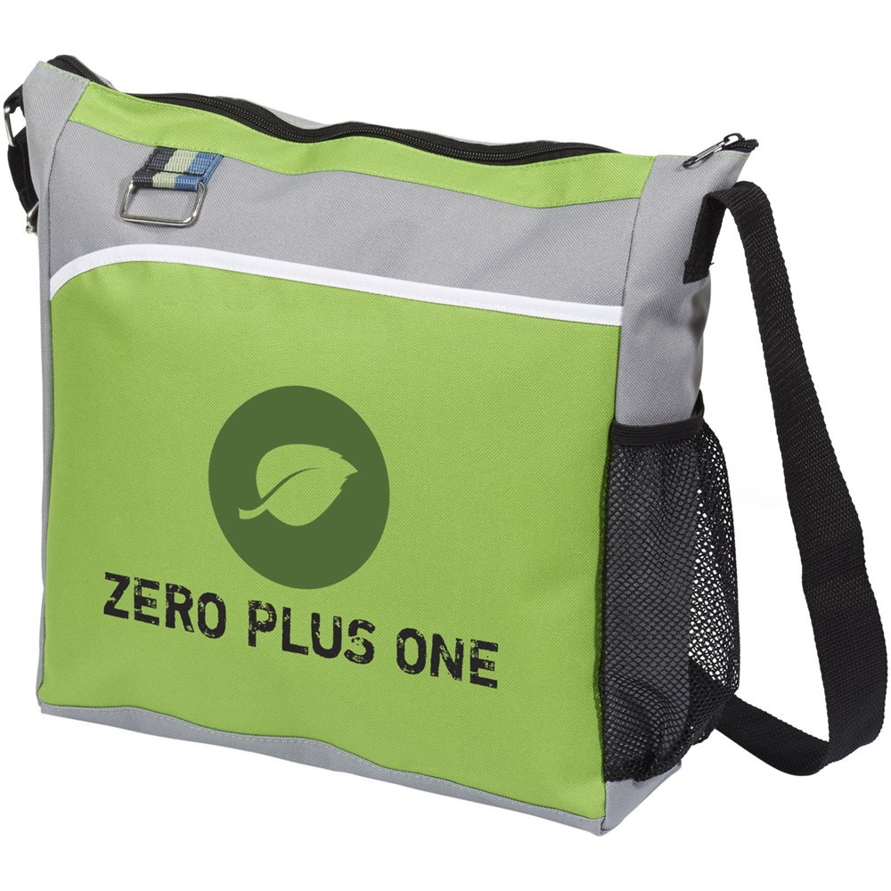 Hoofdvak met ritssluiting en voorvak. Waterfles zak met metalen sleutelhanger. Verstelbare schouderband.