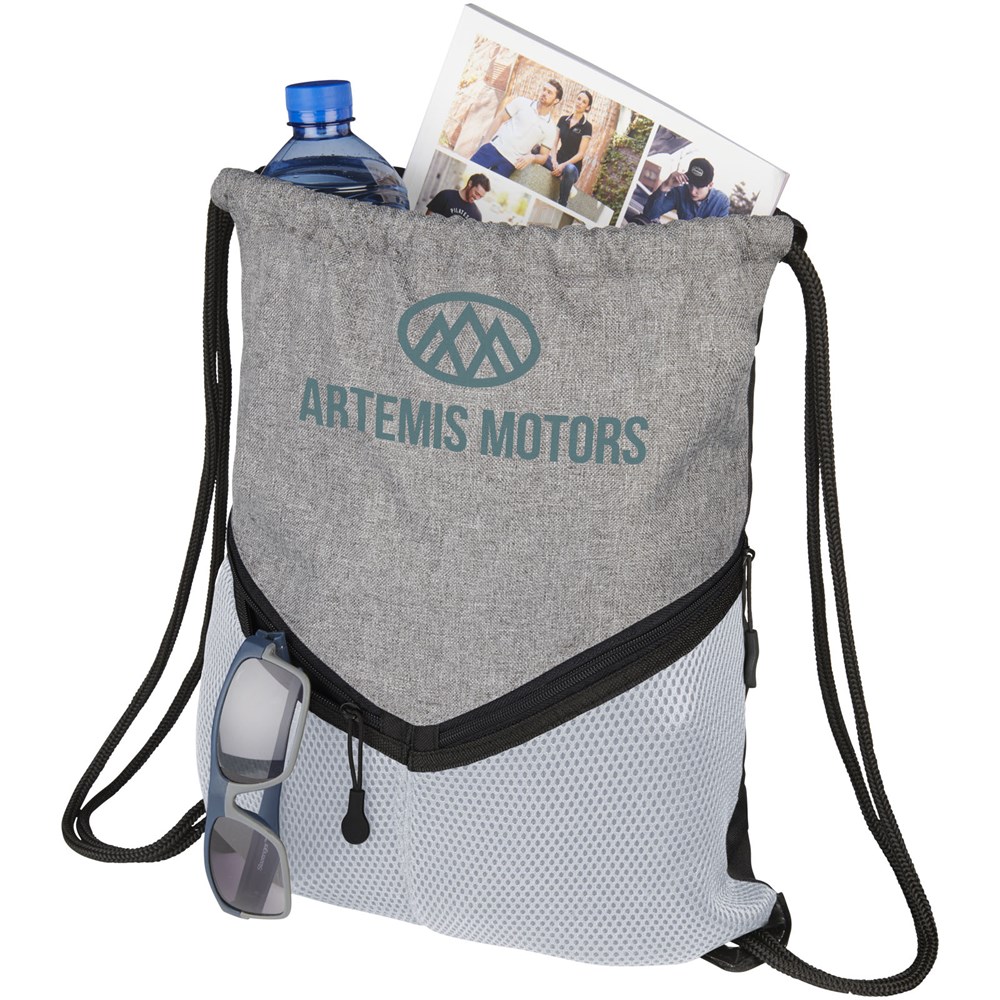 Een sportieve rugzak met een koordsluiting, groot hoofdvak en twee meshvakken met rits.meer