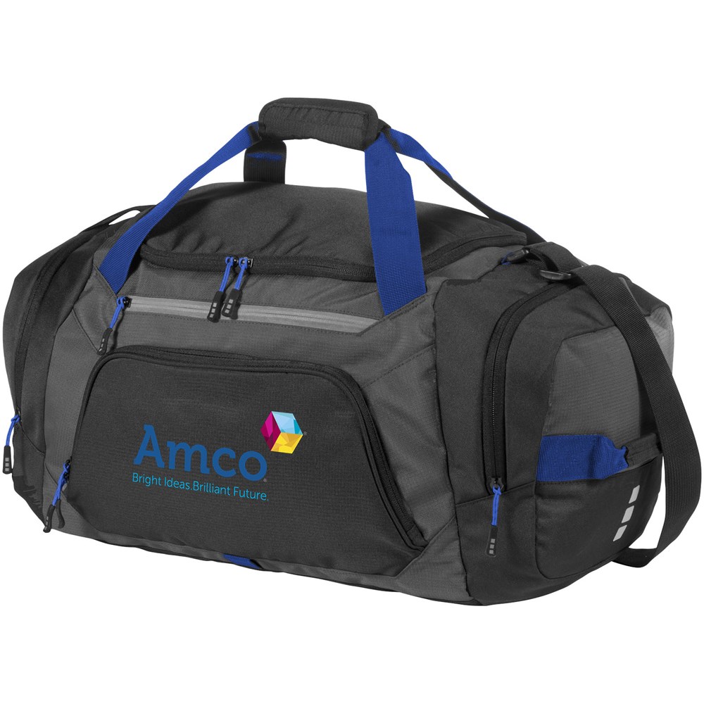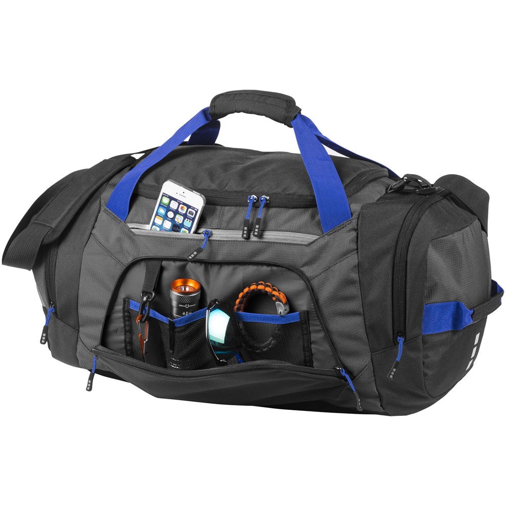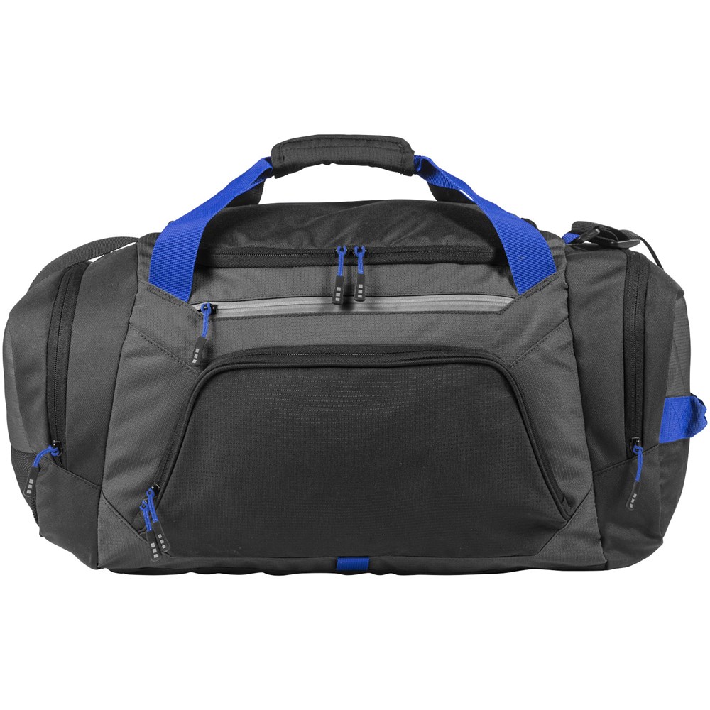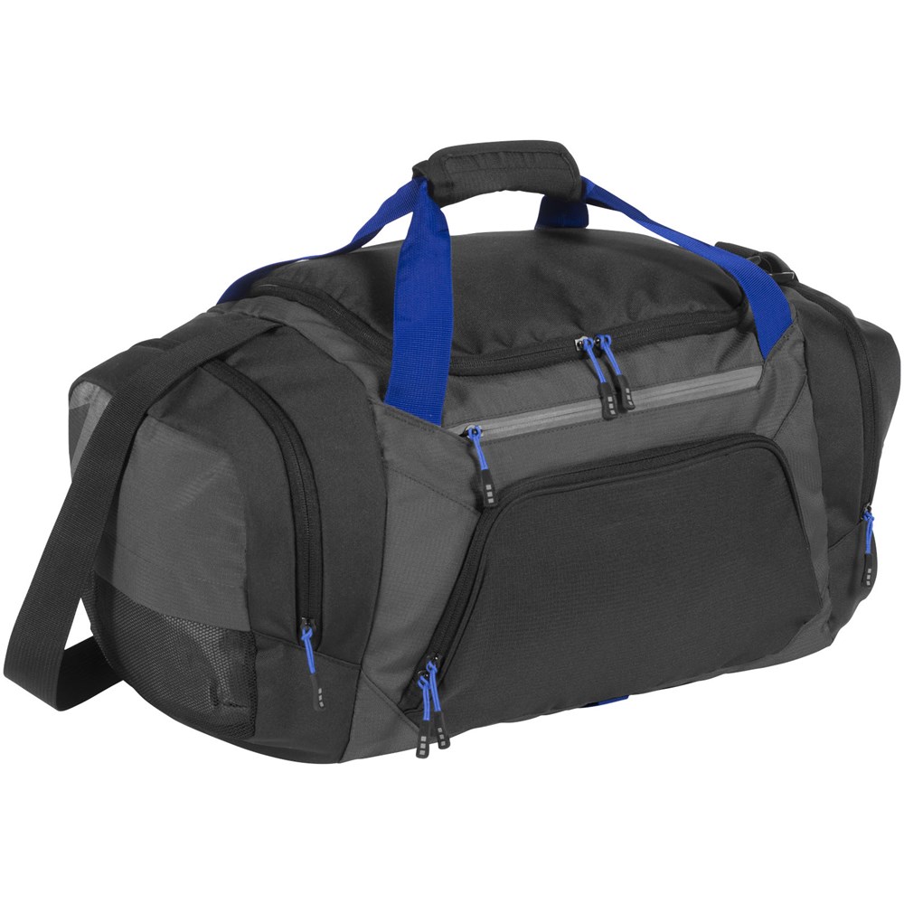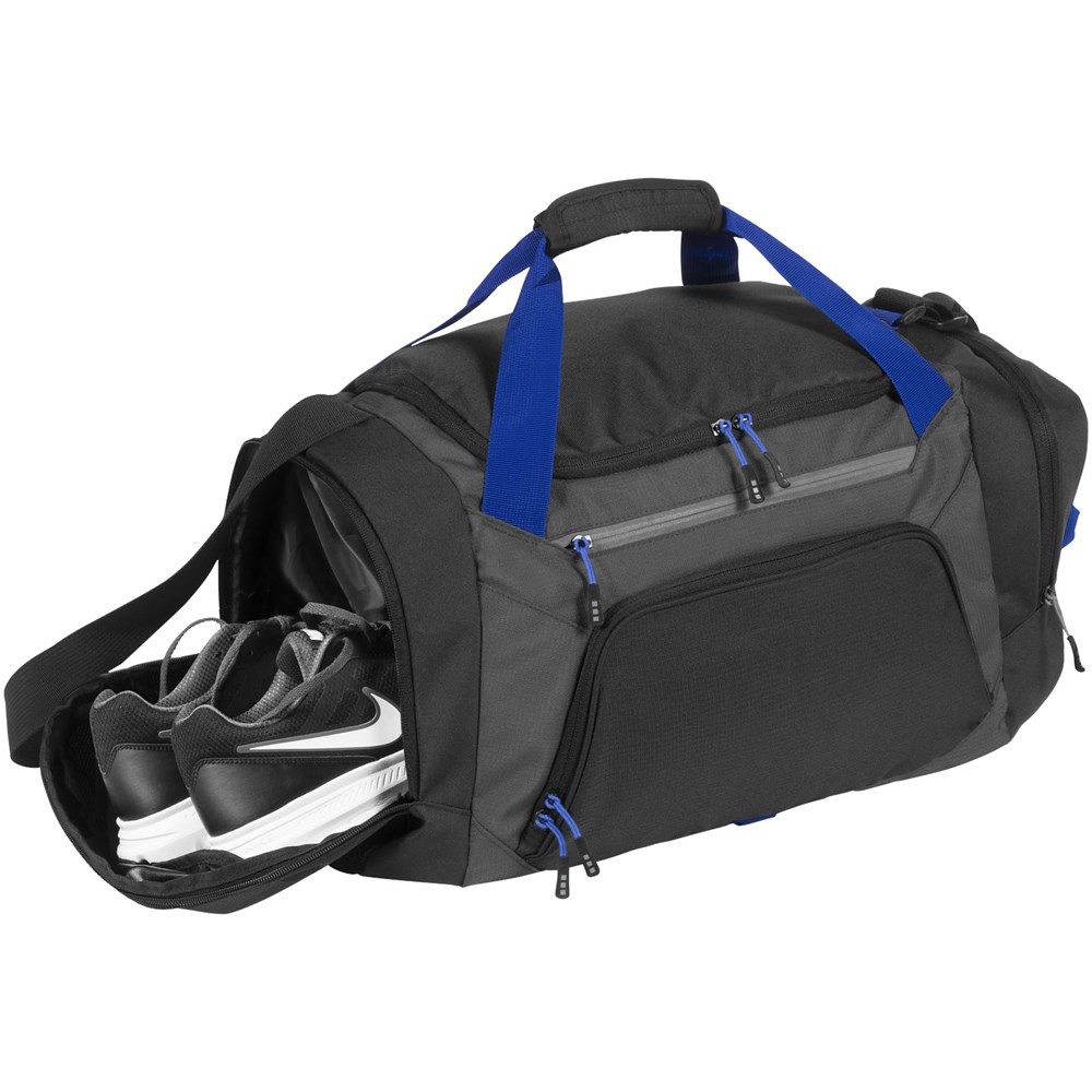 Exclusief ontworpen sporttas met verstelbare schouderbanden. Eén van de twee zijvakken is een geventileerd schoenenvak. Easy-access vak en ritsvak met 2 binnenvakken. Het hoofdvak bevat een extra gaasvak met ritssluiting.