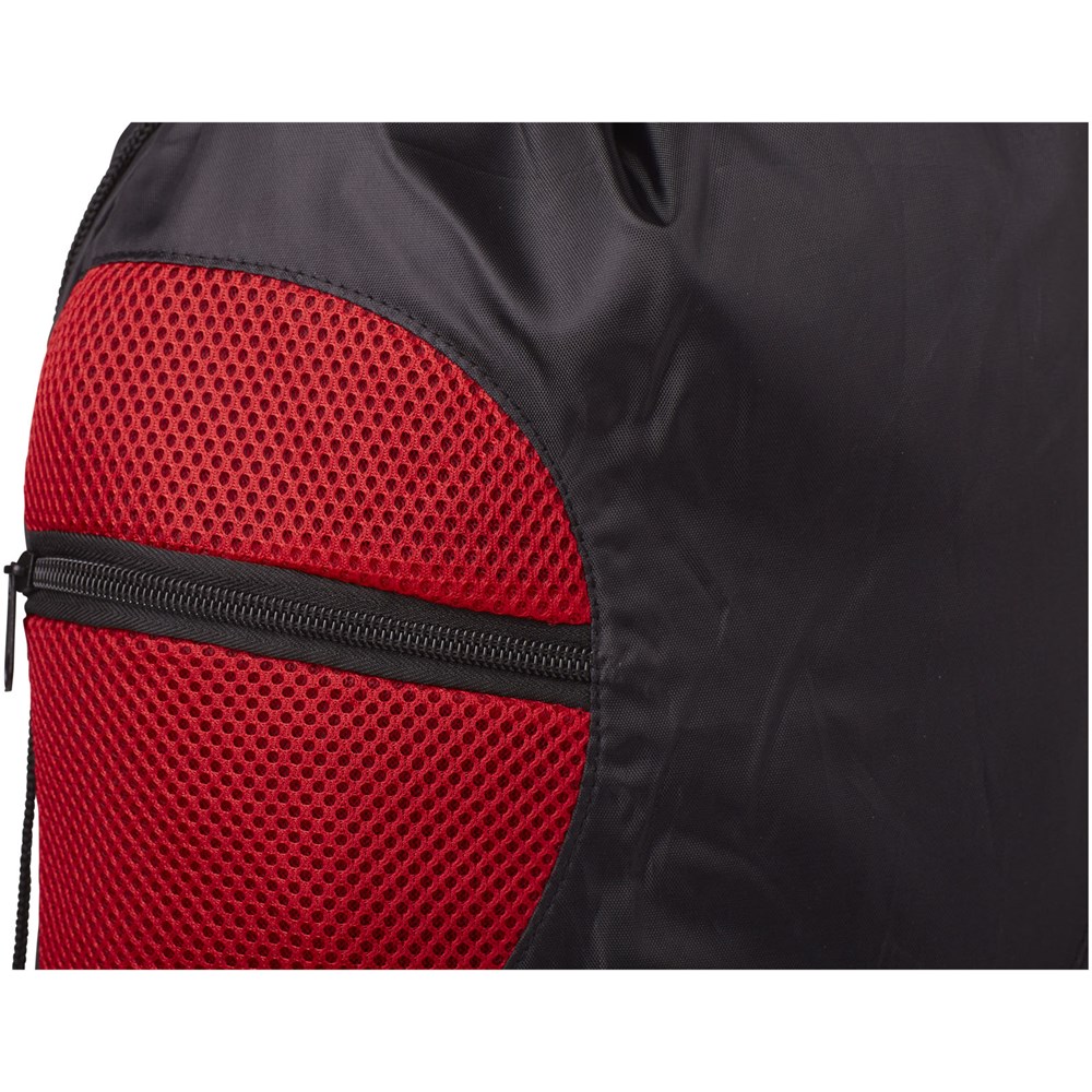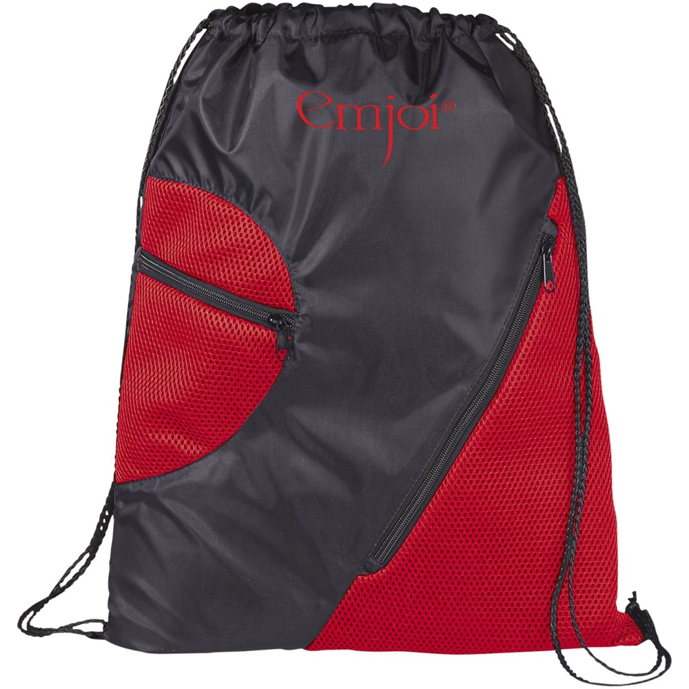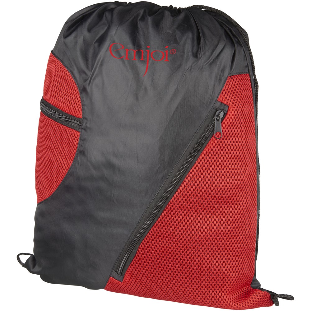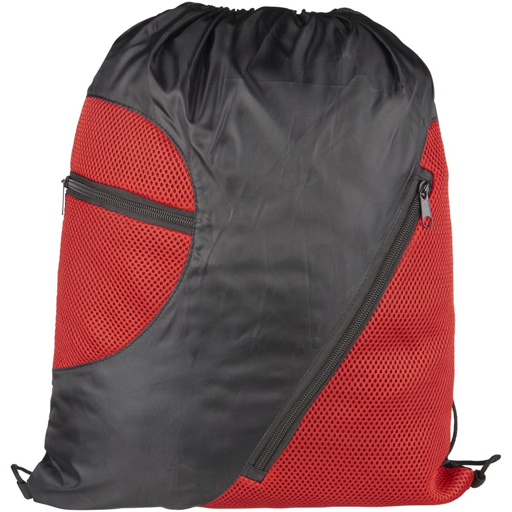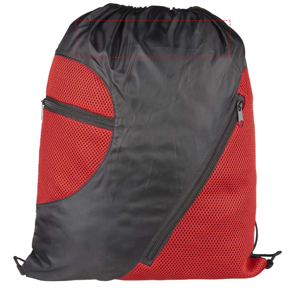 Tas met groot hoofdvak met trekkoordsluiting. Twee voorzakken met ritsen voor extra opslag.