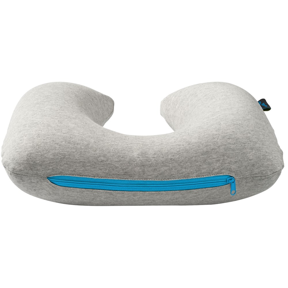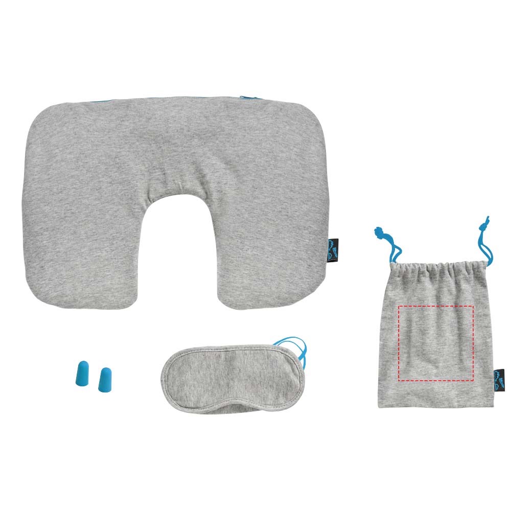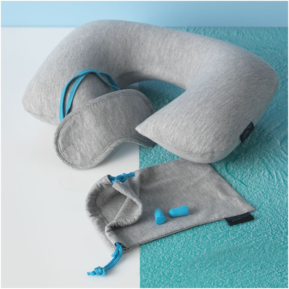 Reisset met lichtblauwe accenten bestaande uit opblaasbaar nekkussen met rits, oogmasker met elastiek en zachte oordopjes in een tasje met trekkoord.