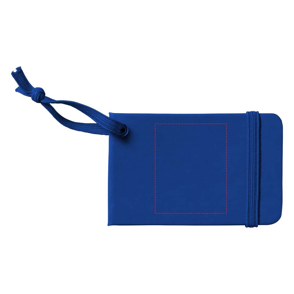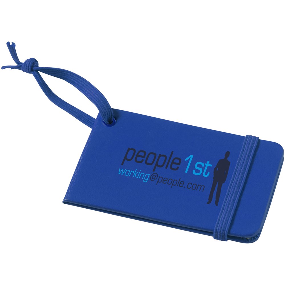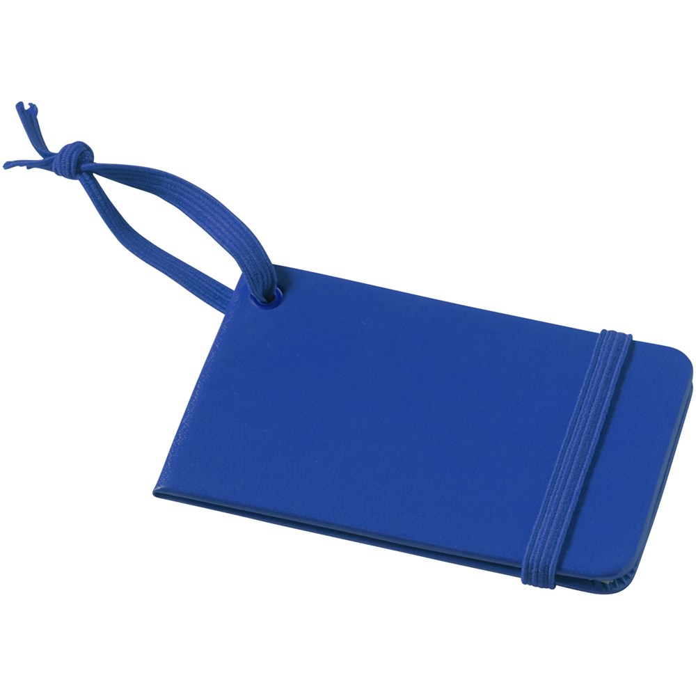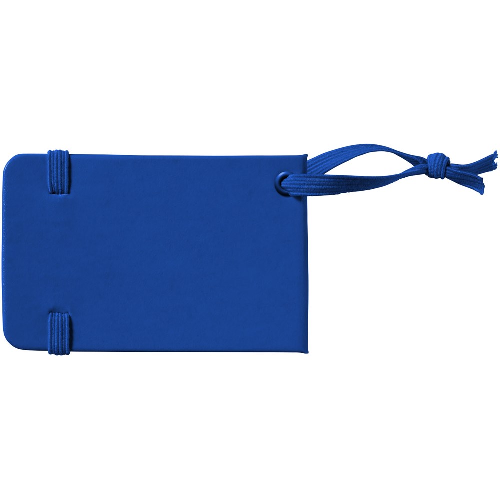 Bagagelabel met elastieksluiting en elastiekband. Kaartje met velden voor naam, adres,...meer