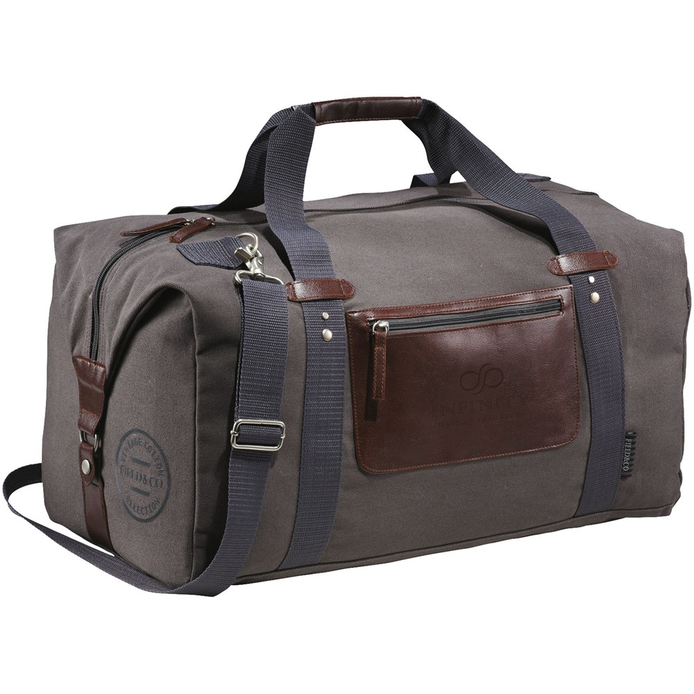 Duffeltas met exclusief design, gemaakt van katoen, met een groot hoofdvak en unieke Field & Co.™ details. Vinyl accenten, voorvak met rits en duurzame handgrepen. Zijden kunnen naar beneden worden gedaan en vastgezet wanneer u niet veel draagt, of u kunt de zijkanten losmaken wanneer de tas volledig is gevuld. Geschikt voor bevestiging aan trolleykoffer.