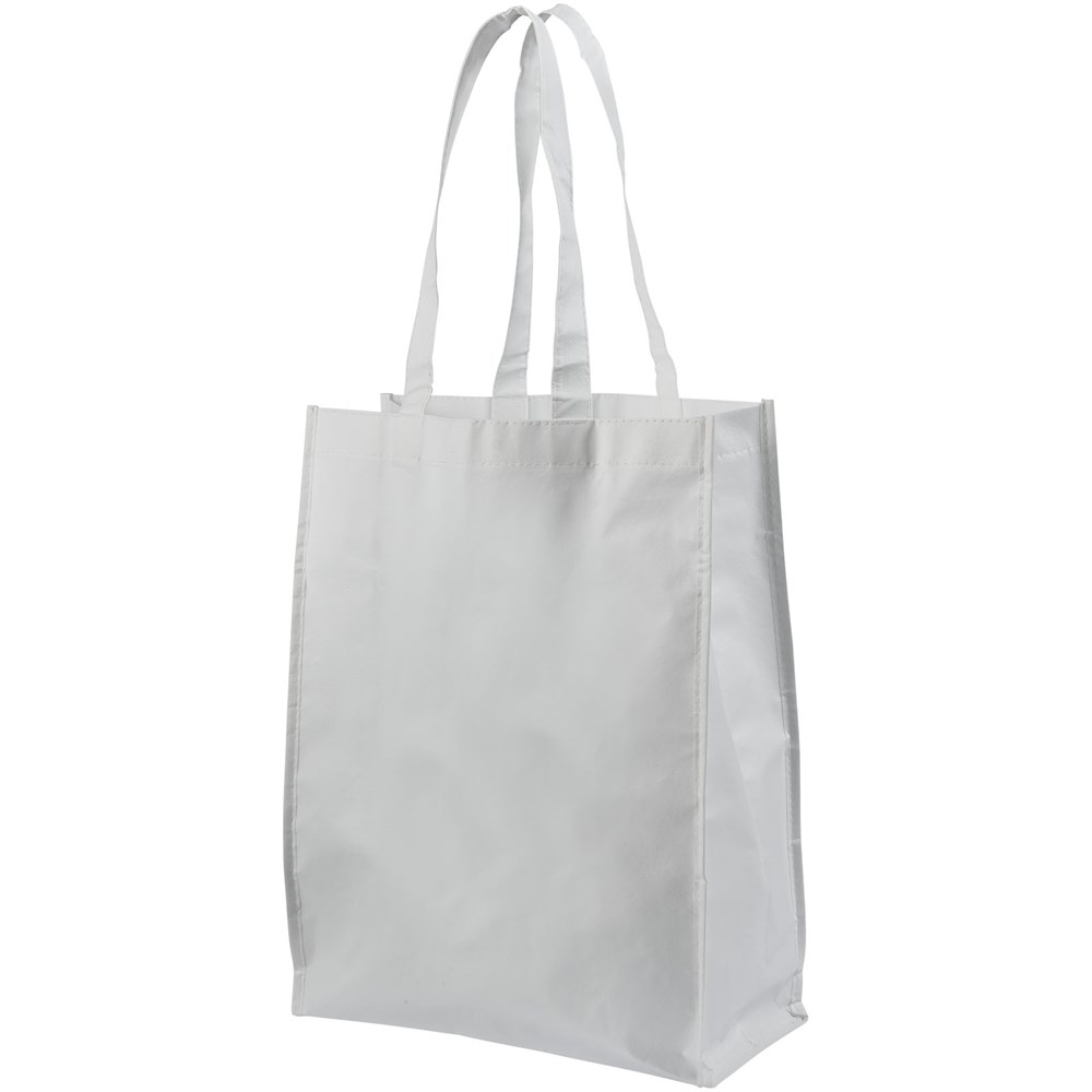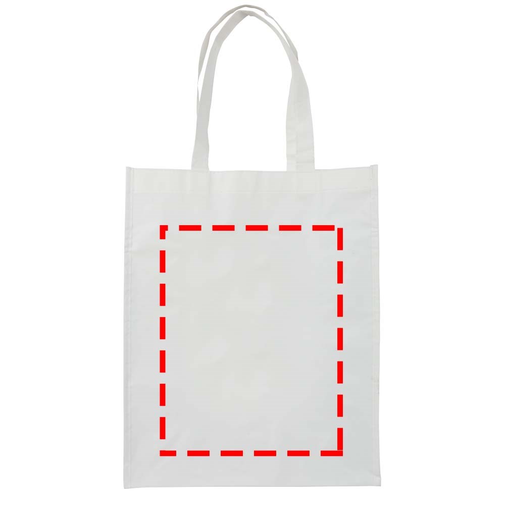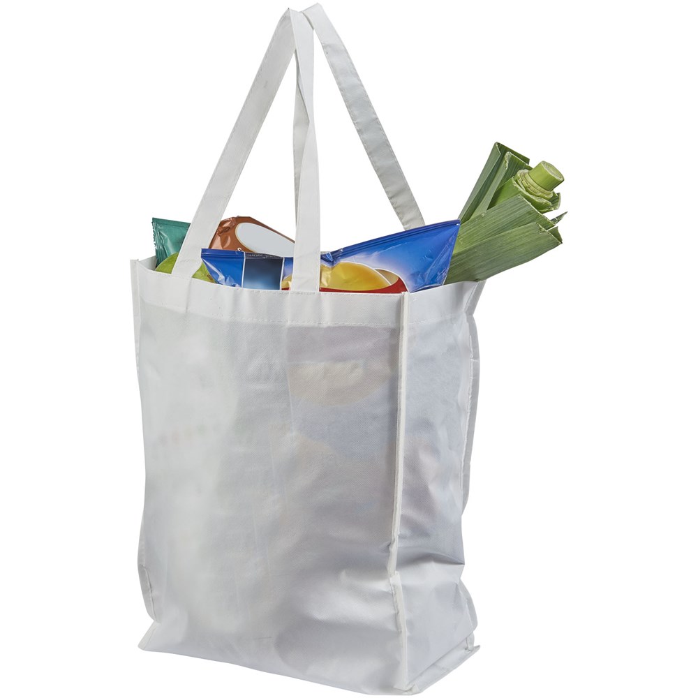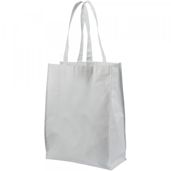 Non woven gelamineerde boodschappentas met open hoofdvak. Gelamineerd materiaal is waterbestendigd en gemakkelijk schoon te maken. Draaghoogte 25.5 cm.