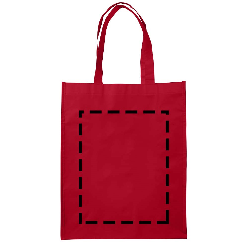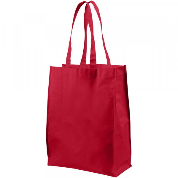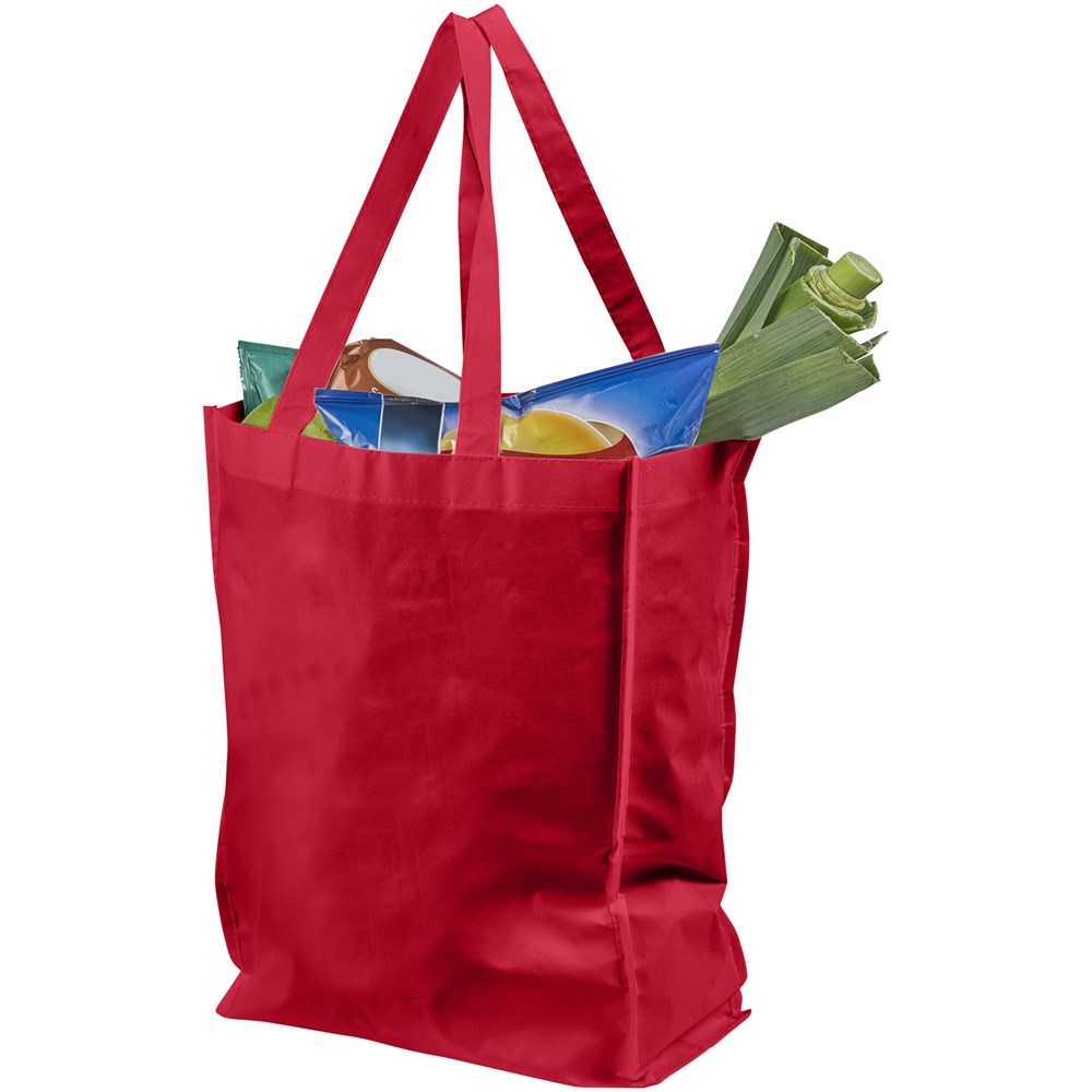 Non woven gelamineerde boodschappentas met open hoofdvak. Gelamineerd materiaal is waterbestendigd en gemakkelijk schoon te maken. Draaghoogte 25.5 cm.