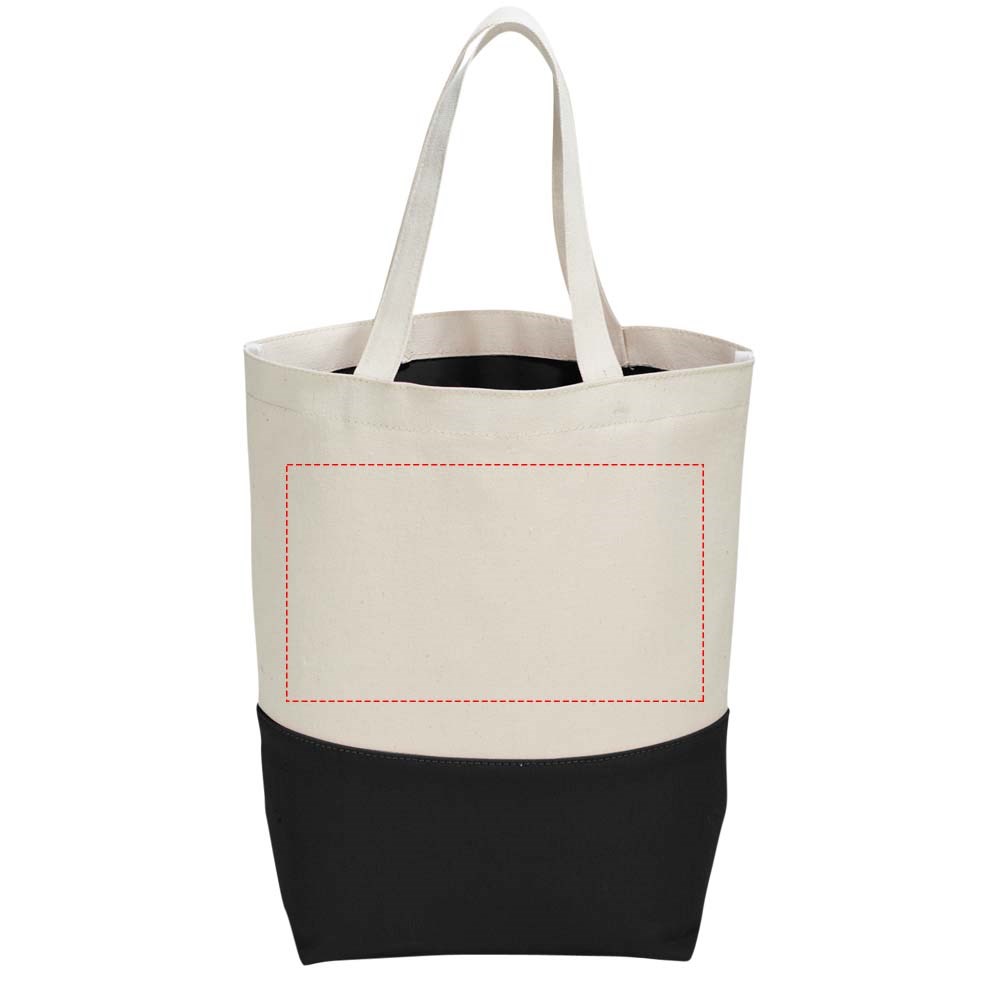 Katoenen boodschappentas beschikt over een aantrekkelijk contrastkleuren accent aan de onderzijde van de tas. De contrasterende kleur wordt herhaald aan de binnenzijde van de tas in de PVC voering. Deze voering laat zich eenvoudig reinigen en is perfect voor strand of zwemkleding. Voorzien van bodemplaat voor extra versteviging. Draaghoogte 18 cm.