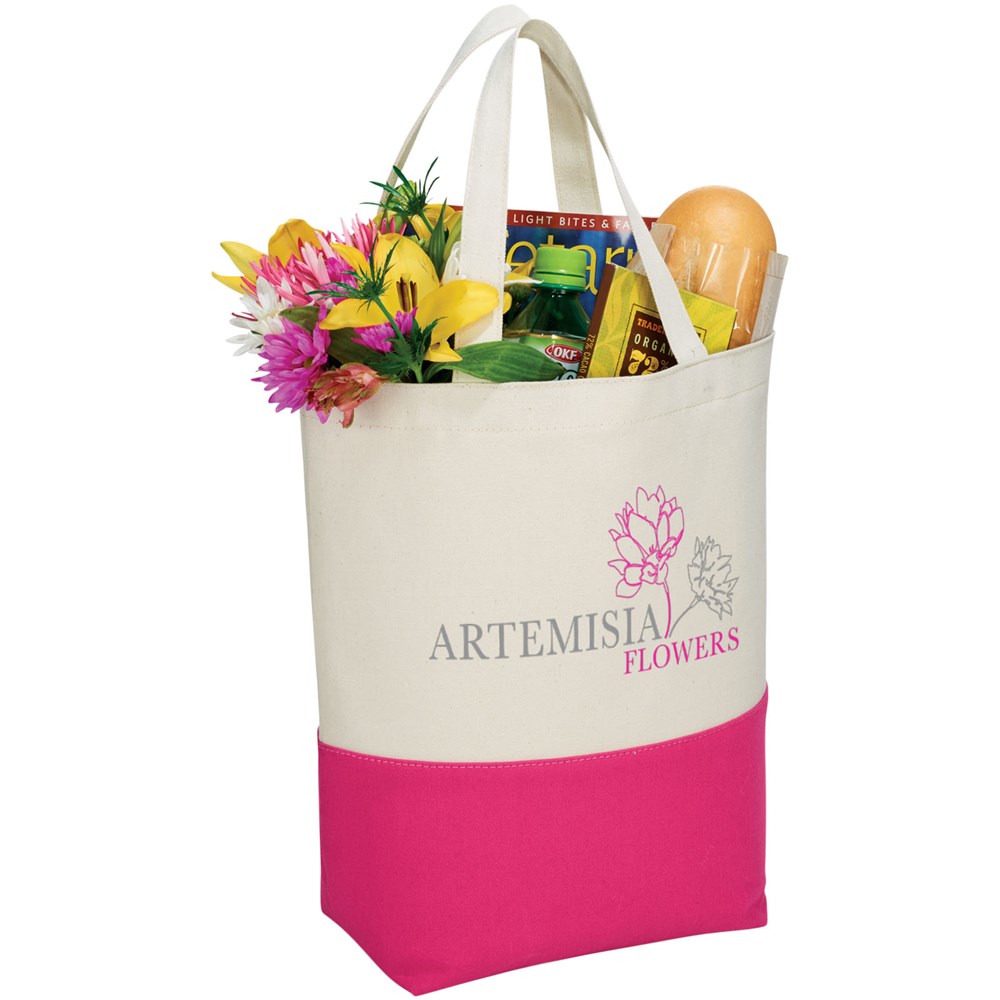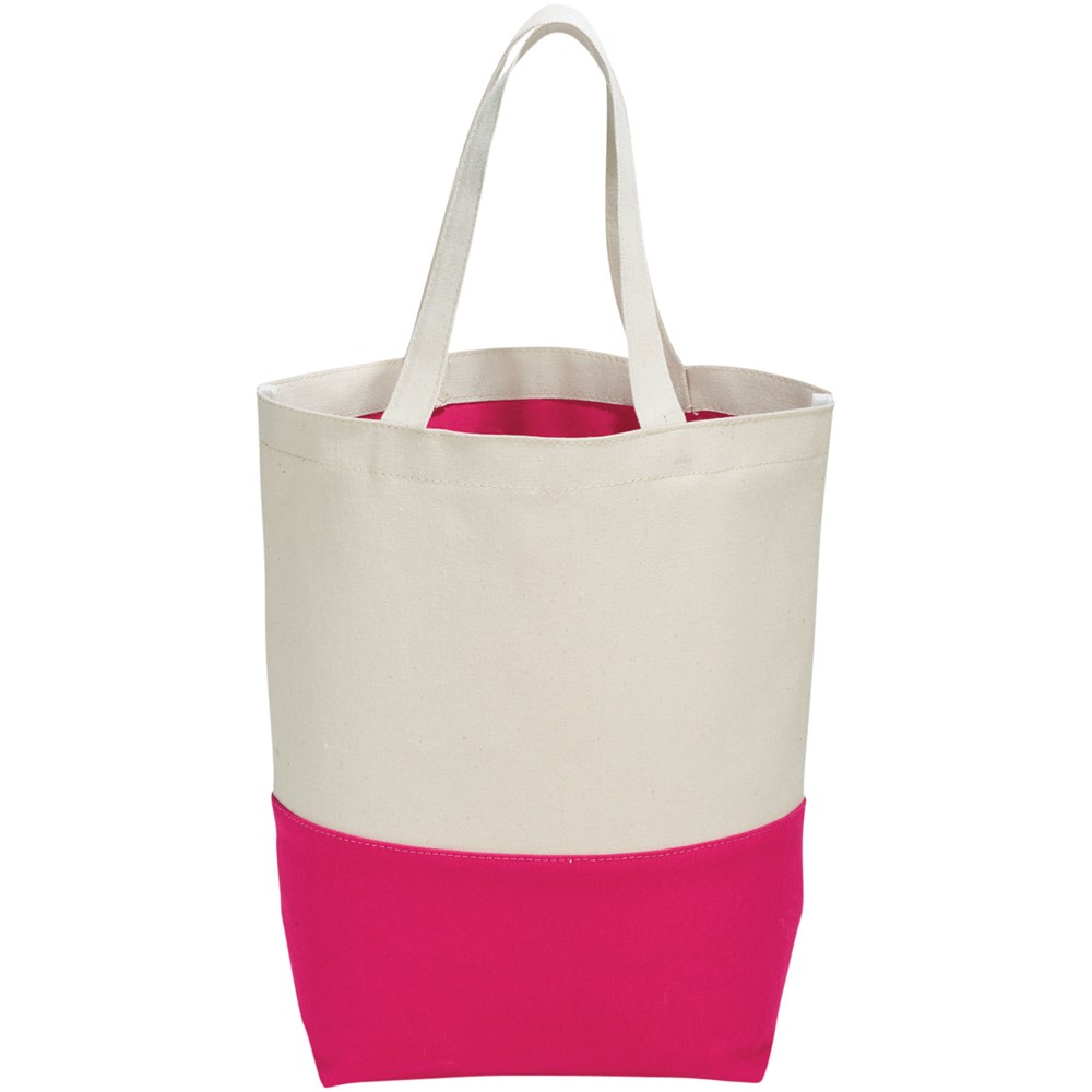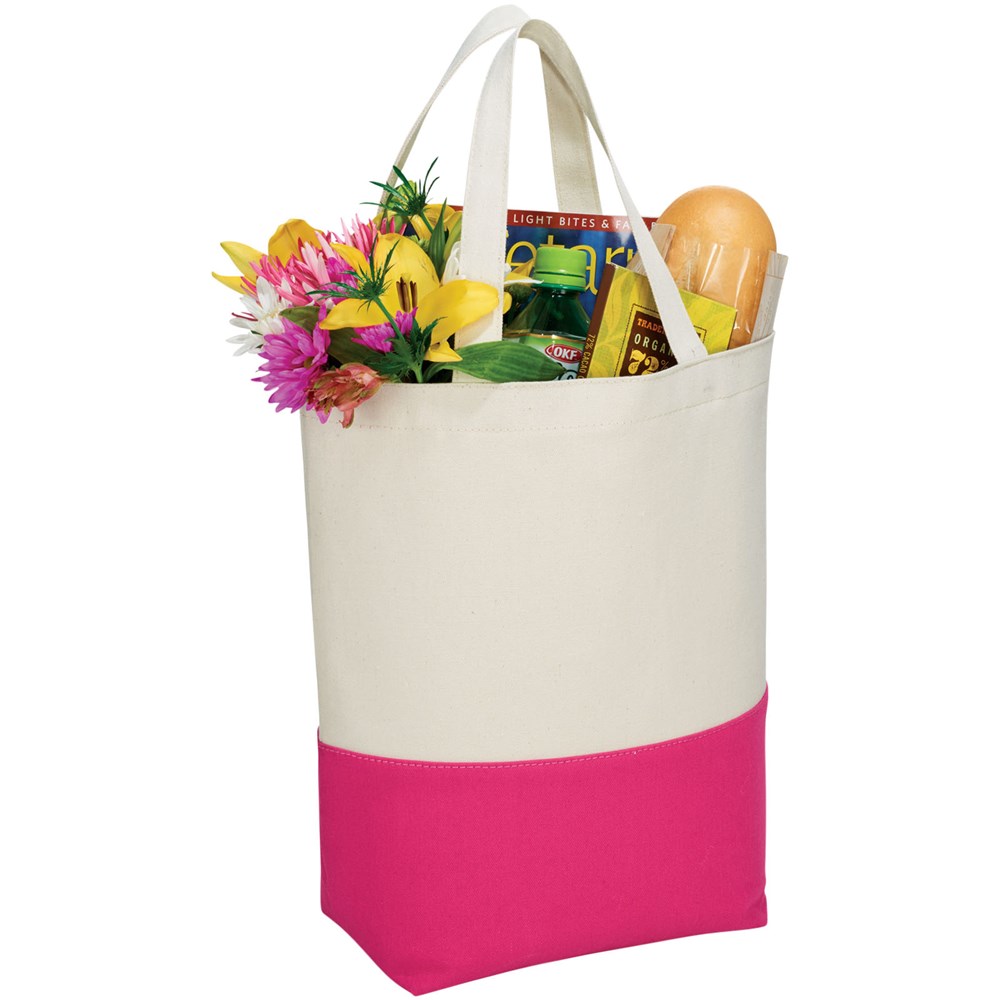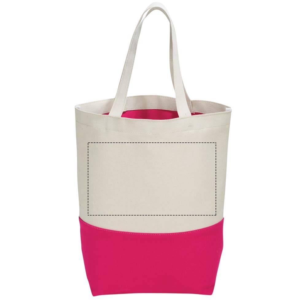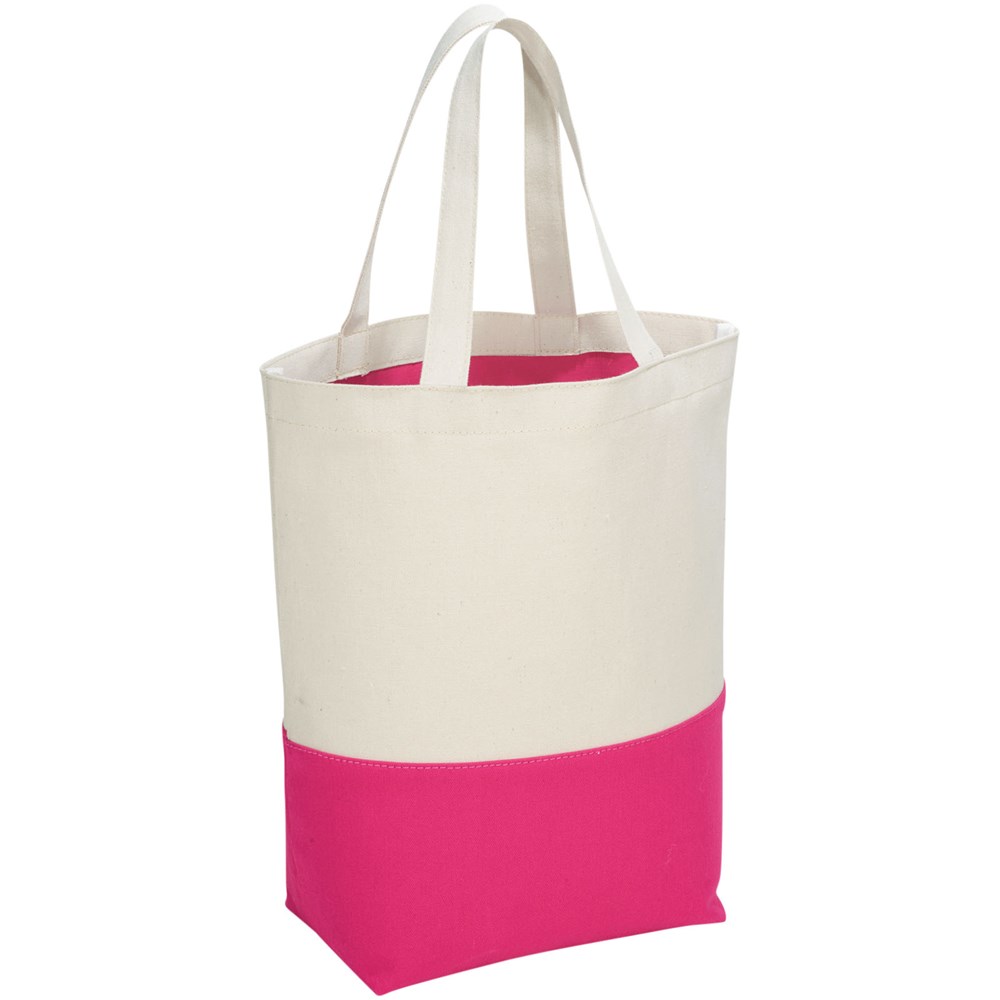 Katoenen boodschappentas beschikt over een aantrekkelijk contrastkleuren accent aan de onderzijde van de tas. De contrasterende kleur wordt herhaald aan de binnenzijde van de tas in de PVC voering. Deze voering laat zich eenvoudig reinigen en is perfect voor strand of zwemkleding. Voorzien van bodemplaat voor extra versteviging. Draaghoogte 18 cm.
