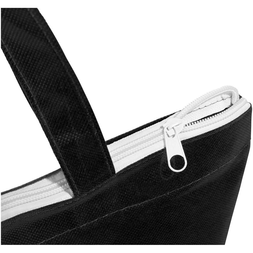 Non woven tas met rits, gestikte afwerking en een hengsel van 19 cm. Een praktisch model in felle kleuren.