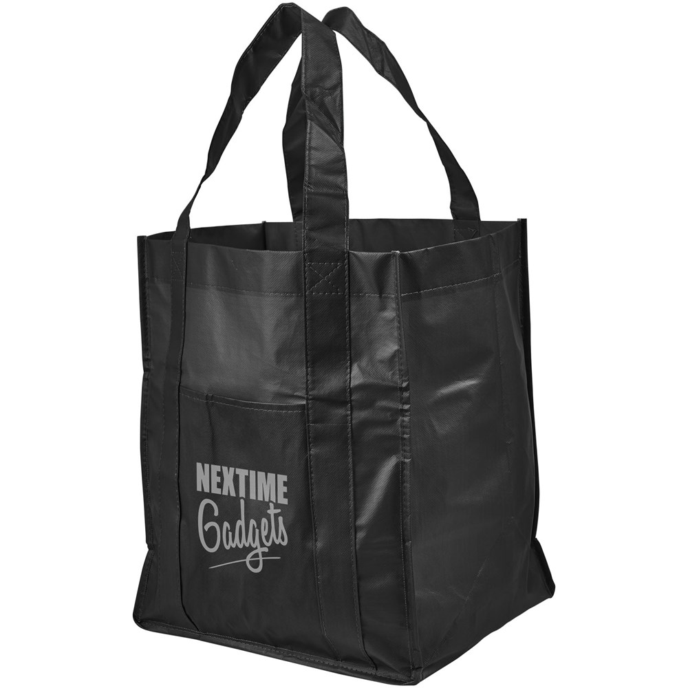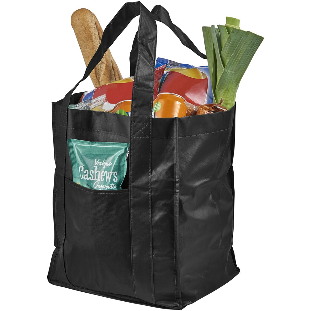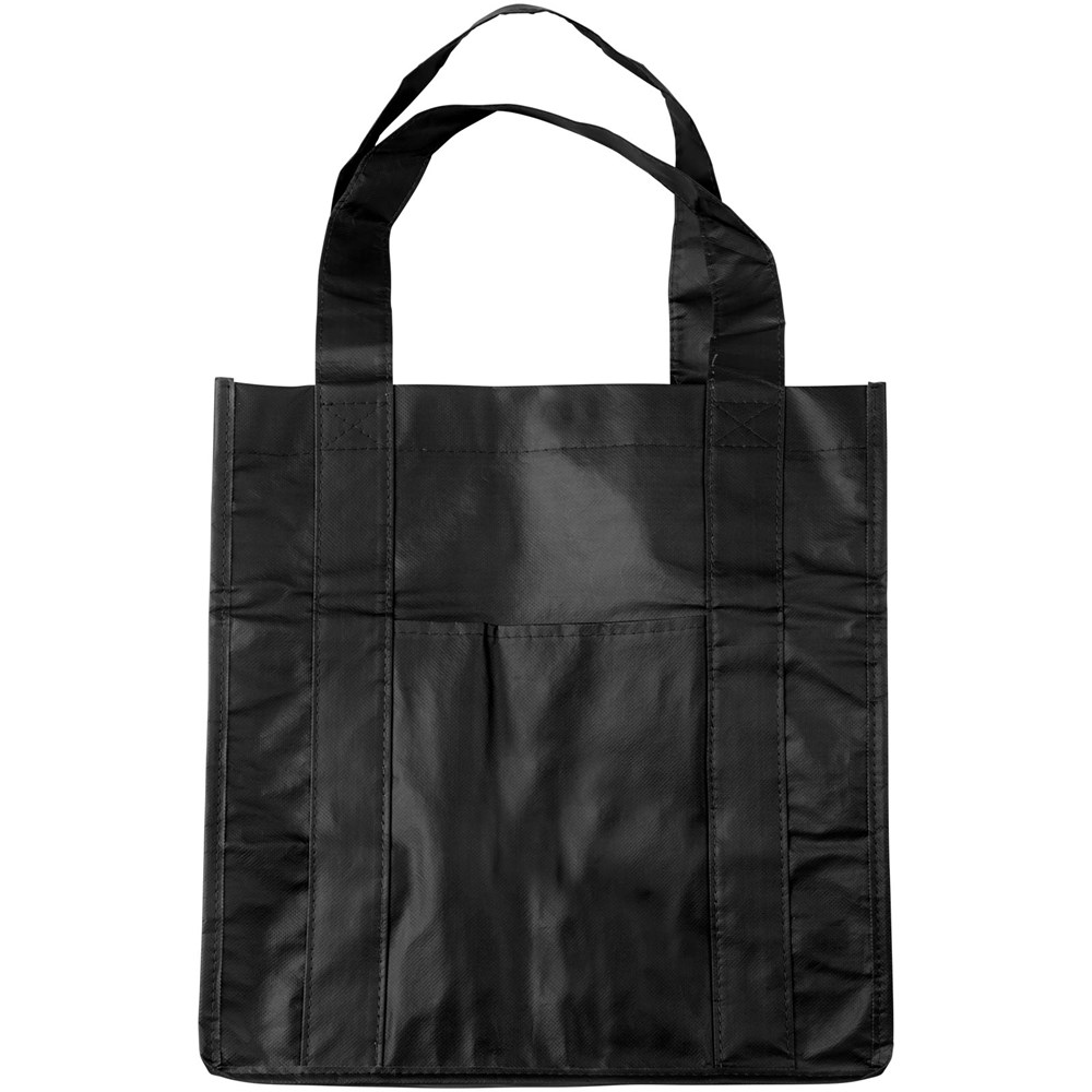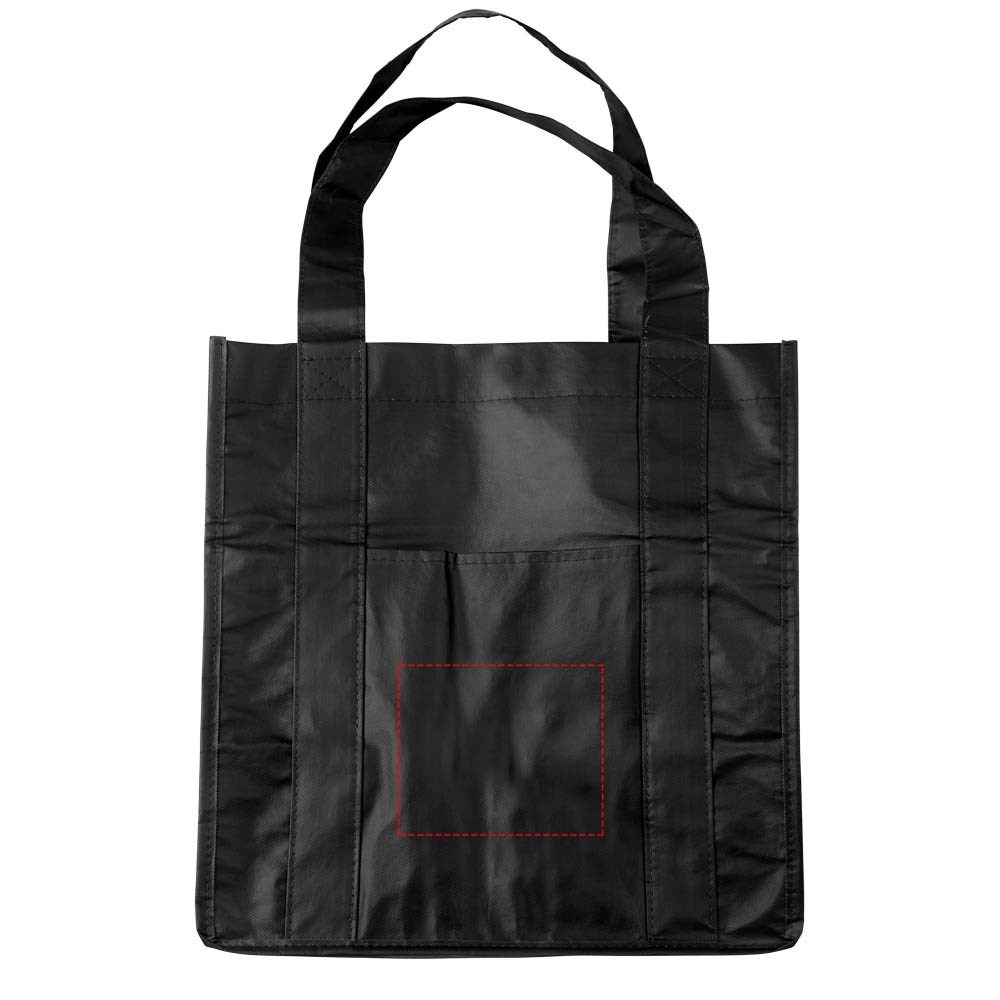 Non woven gelamineerde boodschappentas met open hoofdvak en vakje aan de voorkant. Het gelamineerde materiaal is waterbestendig en gemakkelijk schoon te maken. Draaghoogte 23 cm.