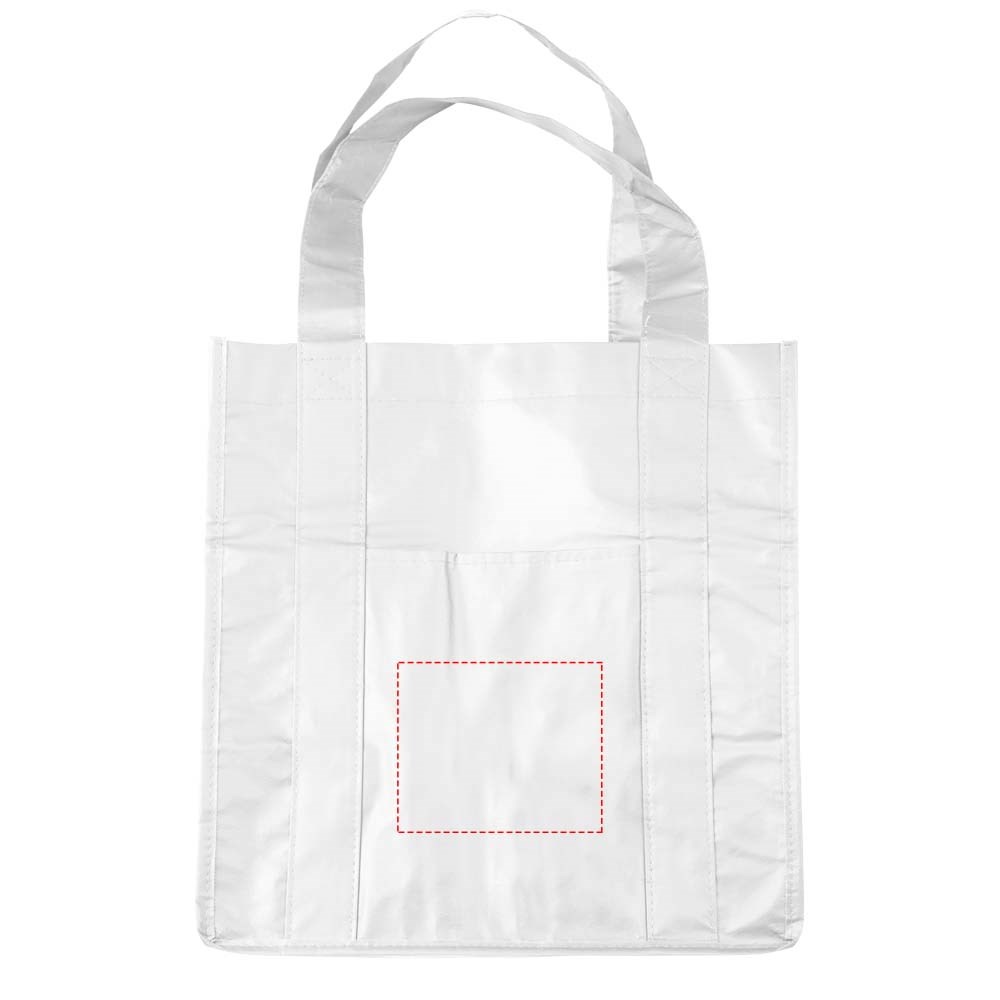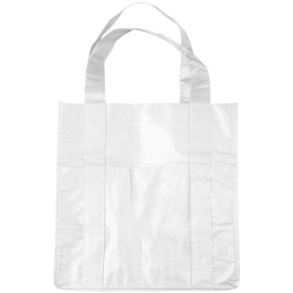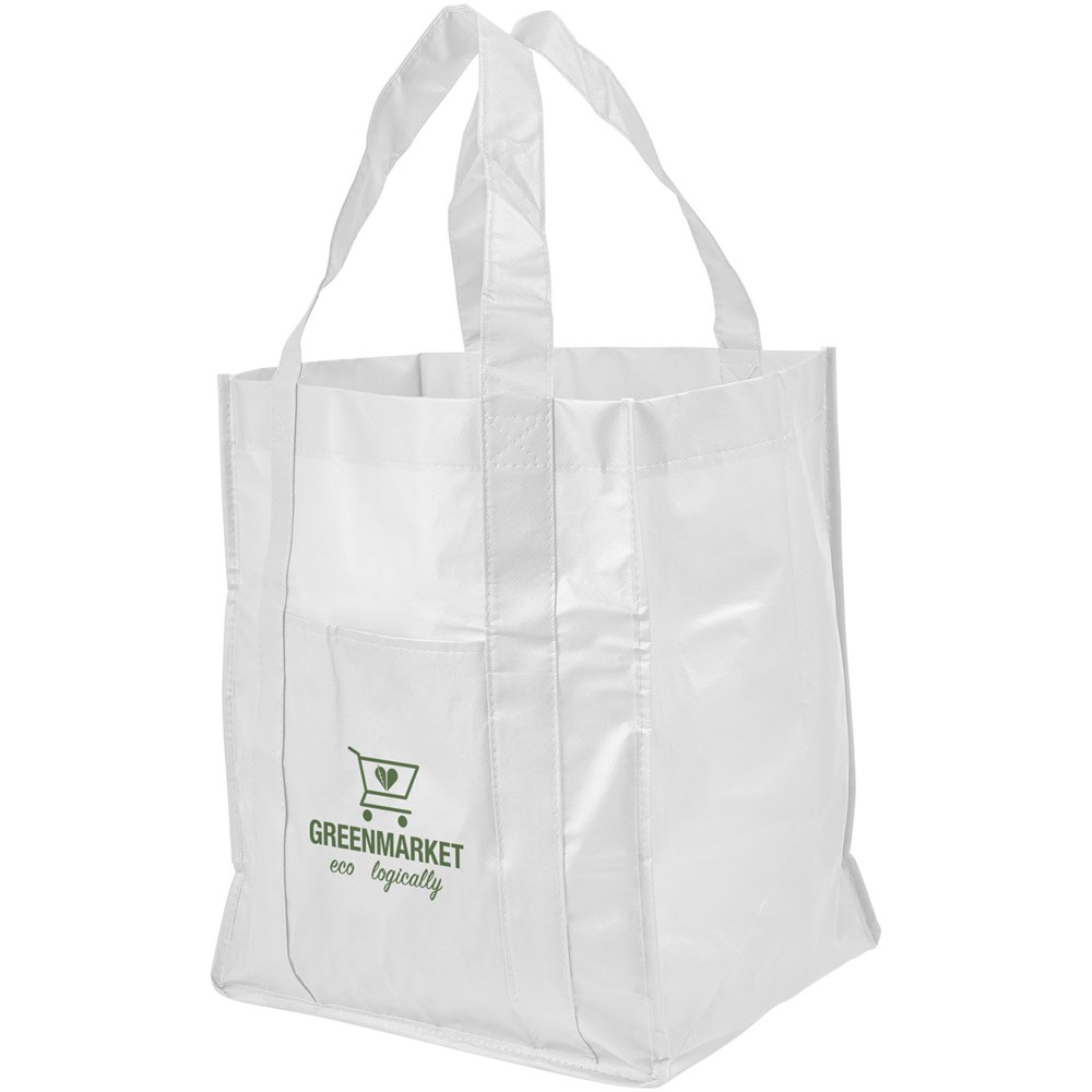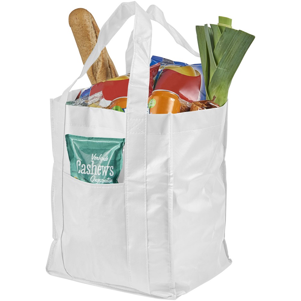 Non woven gelamineerde boodschappentas met open hoofdvak en vakje aan de voorkant. Het gelamineerde materiaal is waterbestendig en gemakkelijk schoon te maken. Draaghoogte 23 cm.