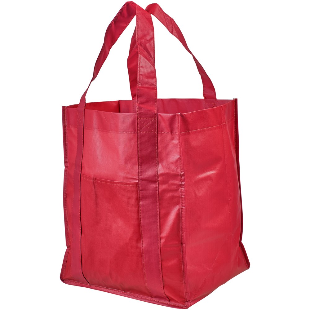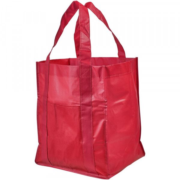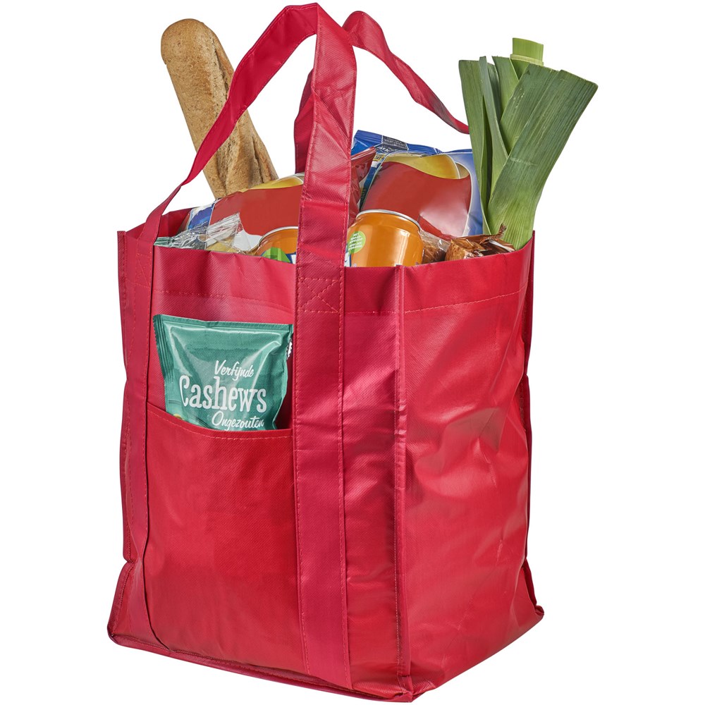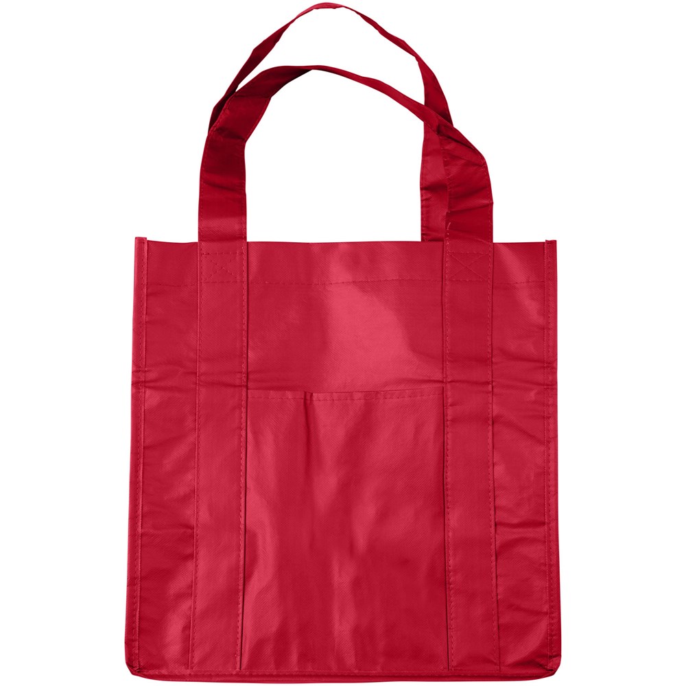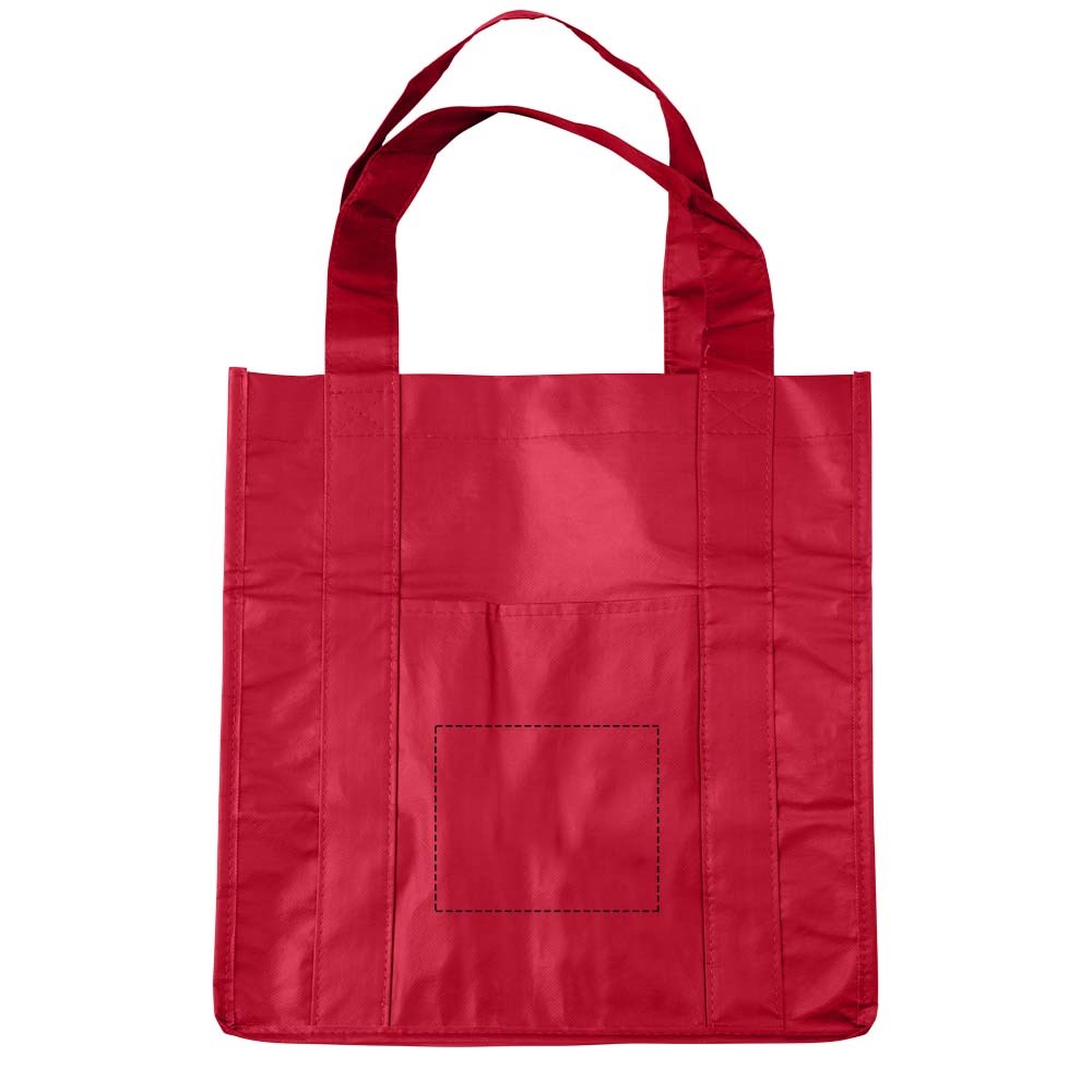 Non woven gelamineerde boodschappentas met open hoofdvak en vakje aan de voorkant. Het gelamineerde materiaal is waterbestendig en gemakkelijk schoon te maken. Draaghoogte 23 cm.