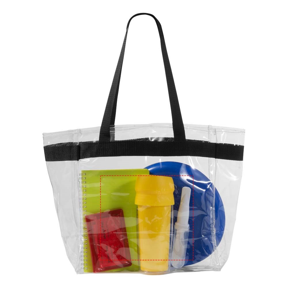 Transparante draagtas, perfect voor een middag in het stadion, een dagje op een festival of gewoon voor werk of school. Open hoofdvak met sportieve gaasrand en dubbele hengsels. Draaghoogte 27 cm. Accessoires niet inbegrepen.